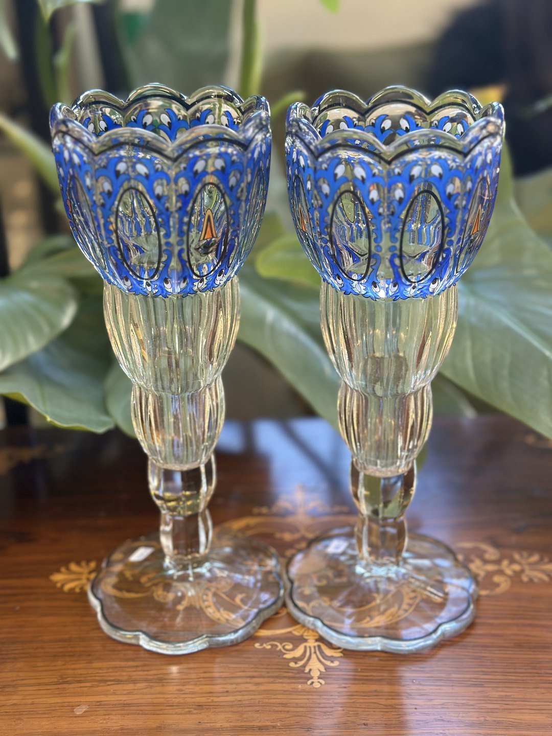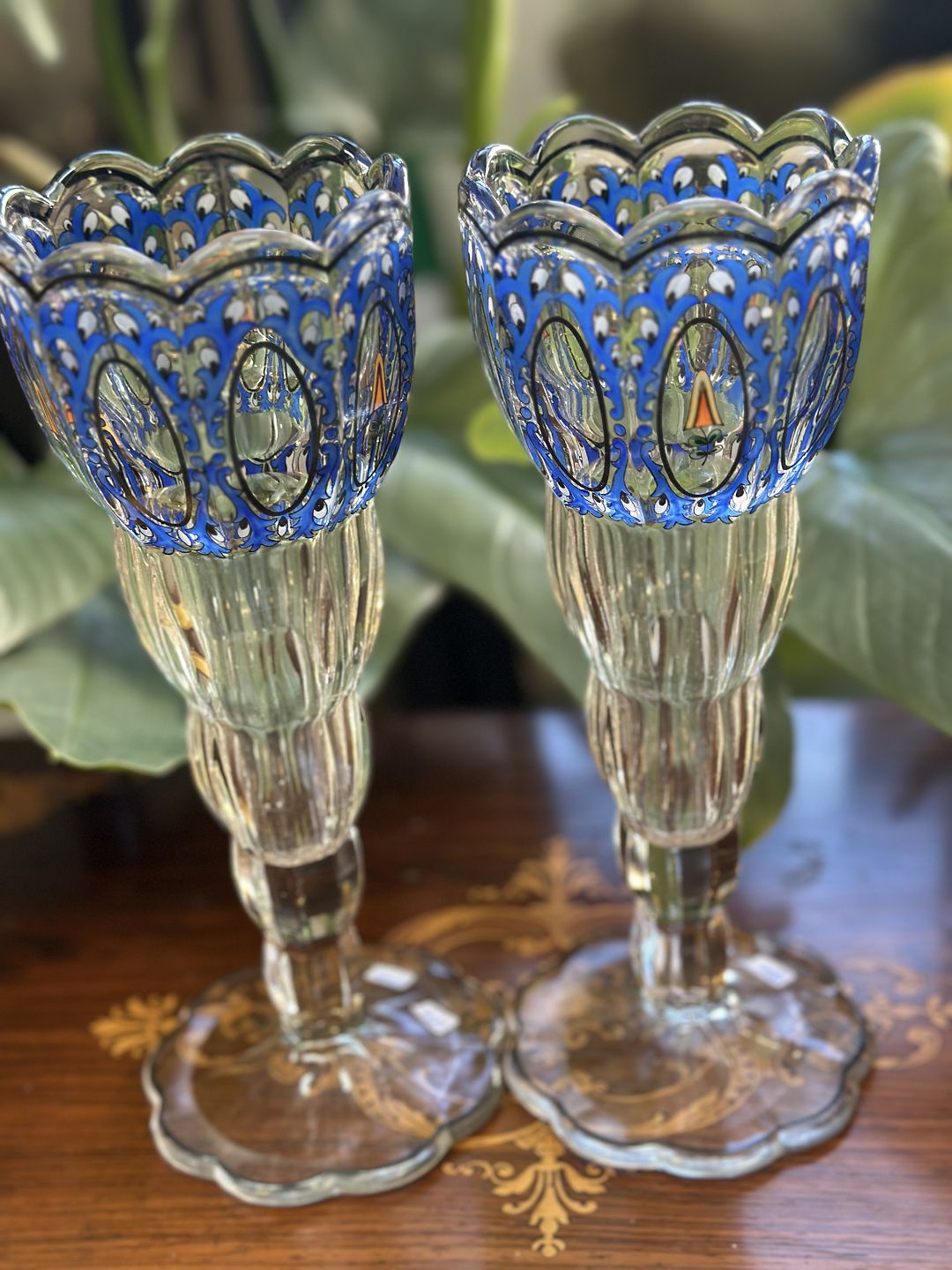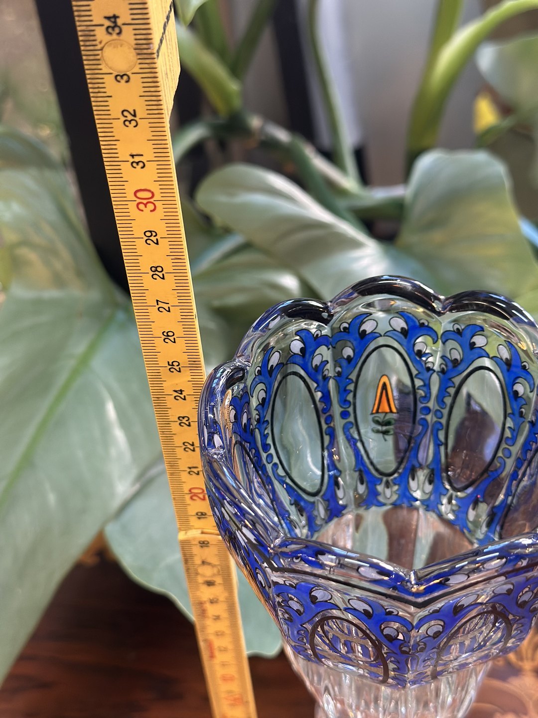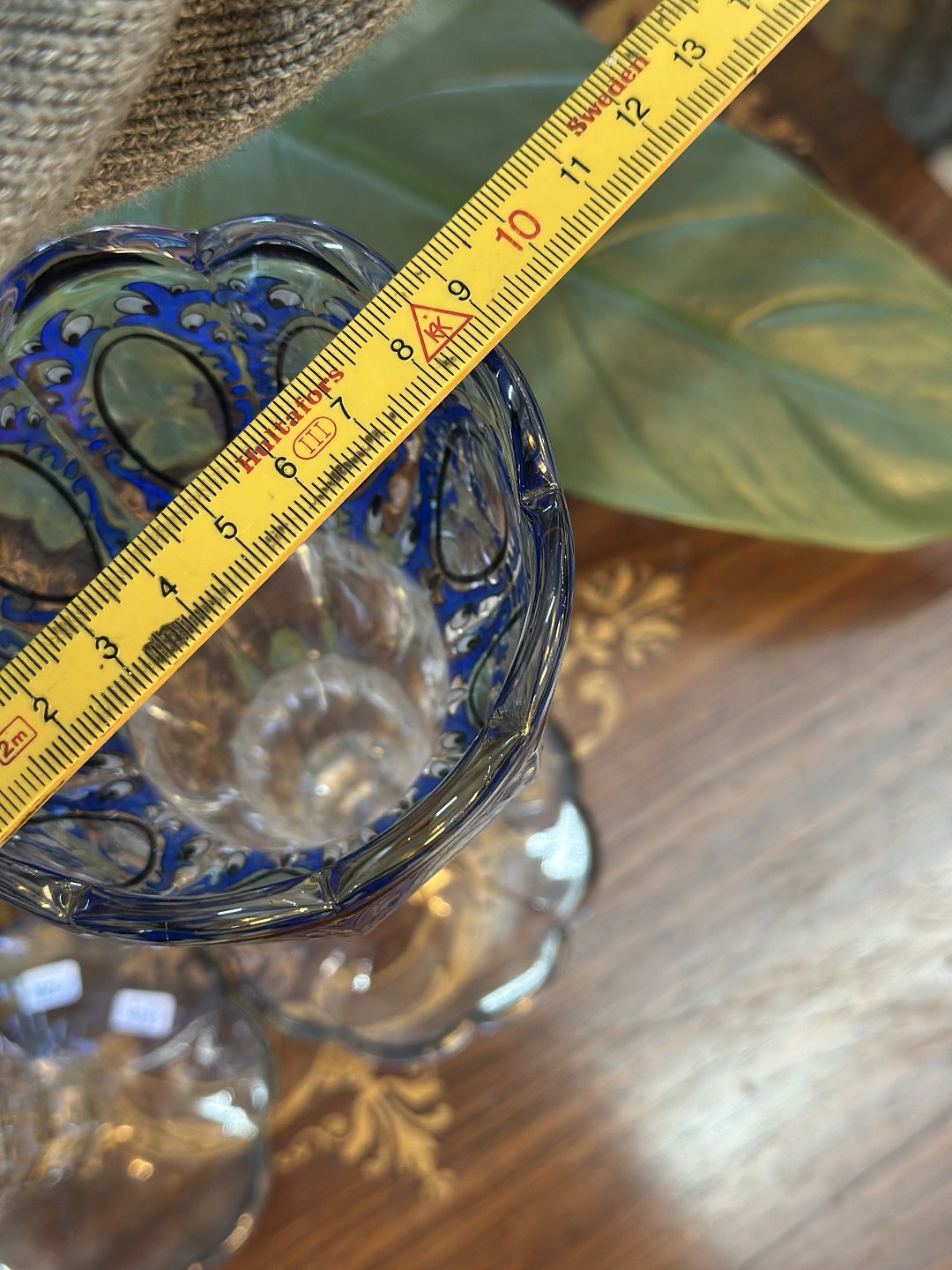 Bohemia krystalvase overfang vase i kobaltblåt glas , slebet dekoreret med guld og emaljemaling , fra Ca 1950 -1970 tallet .flot og pæn stand