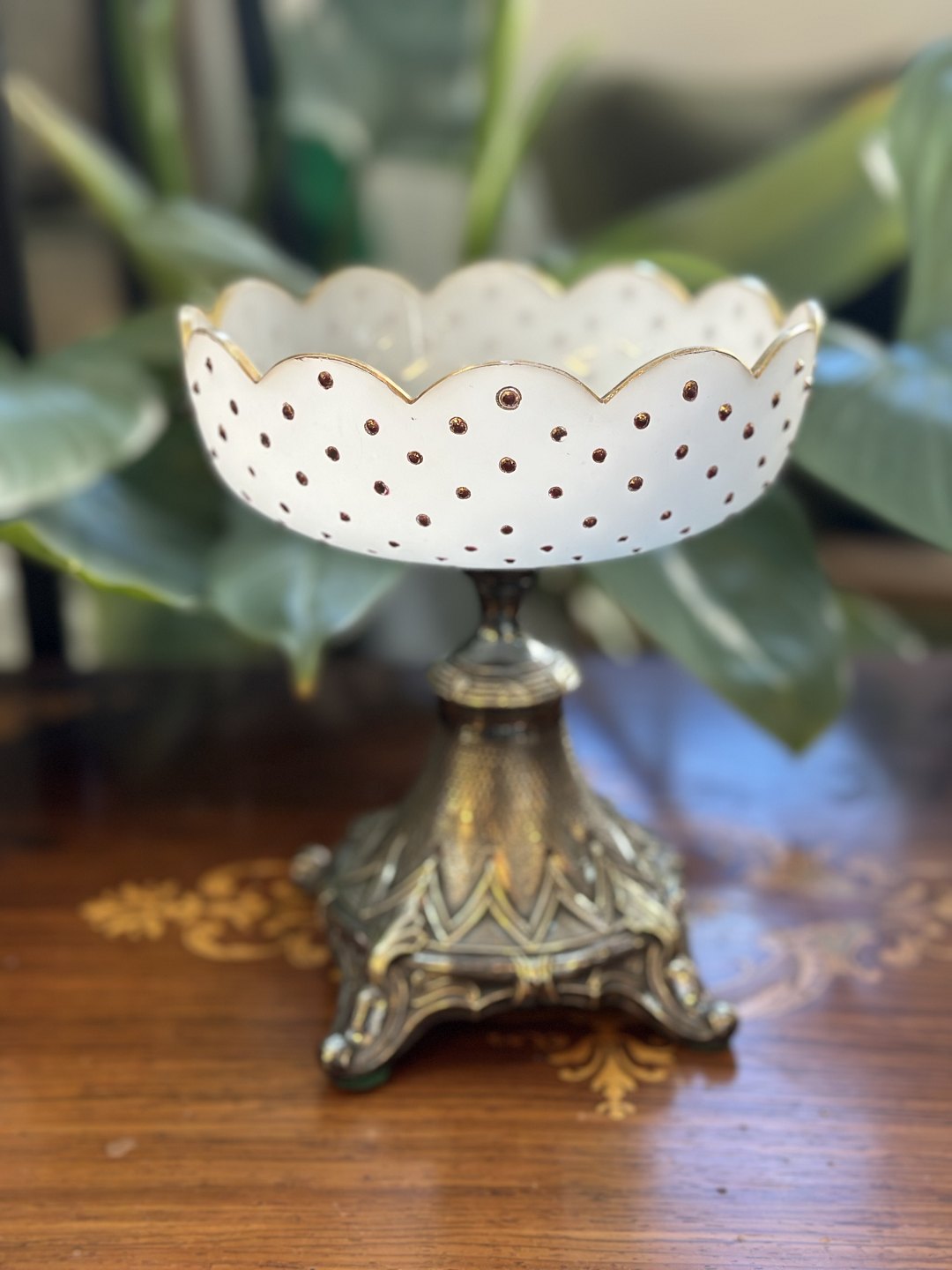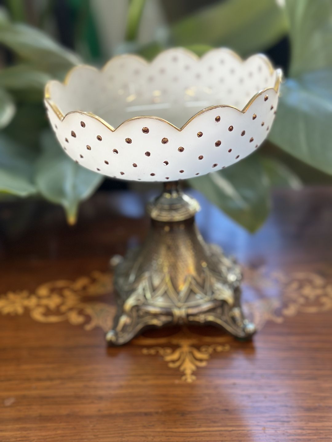 Vintage bowl from the 1800s -1900s, the bowl is in opaline glass (milky white glass) with hand-painted golden dots and gold rim, the foot is in silver plated with decorative art nouveau - baroque inspired details, designed opaline glass from the late 1800s Dealer