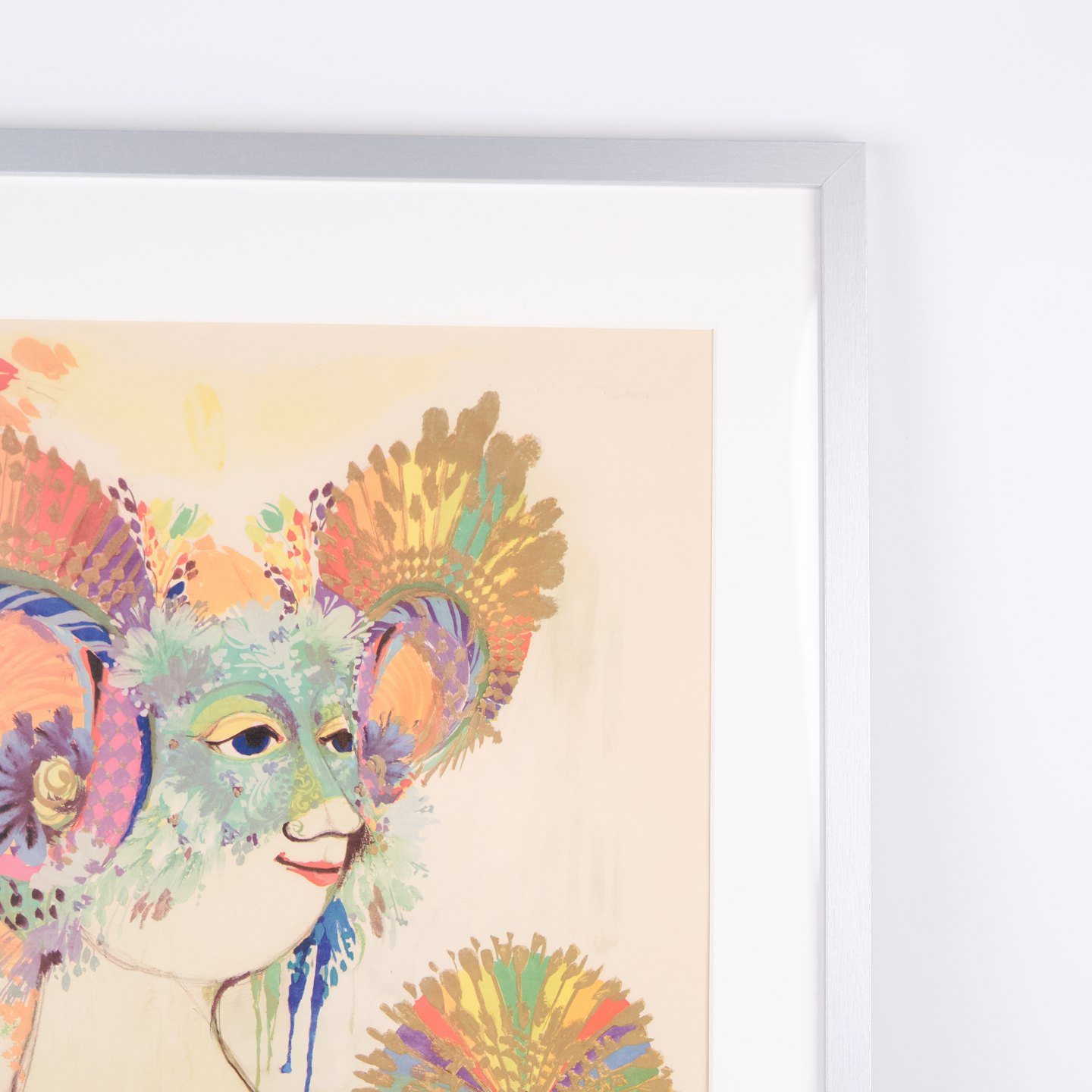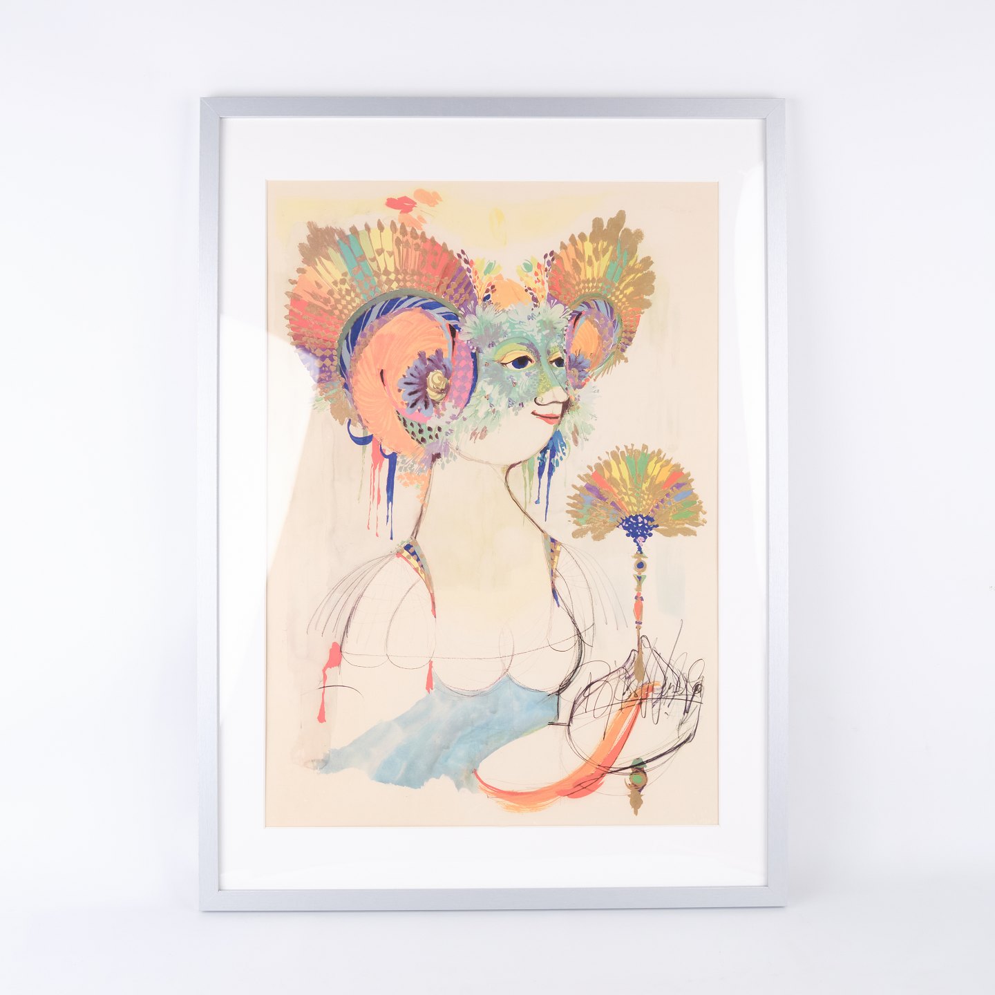 Serigrafisk plakat af Bjørn Wiinblad, signeret. Motiv af kvinde med vifte, 1970’erne. Dekorativt og klassisk Wiinblad-design.— Kunstner: Bjørn Wiinblad