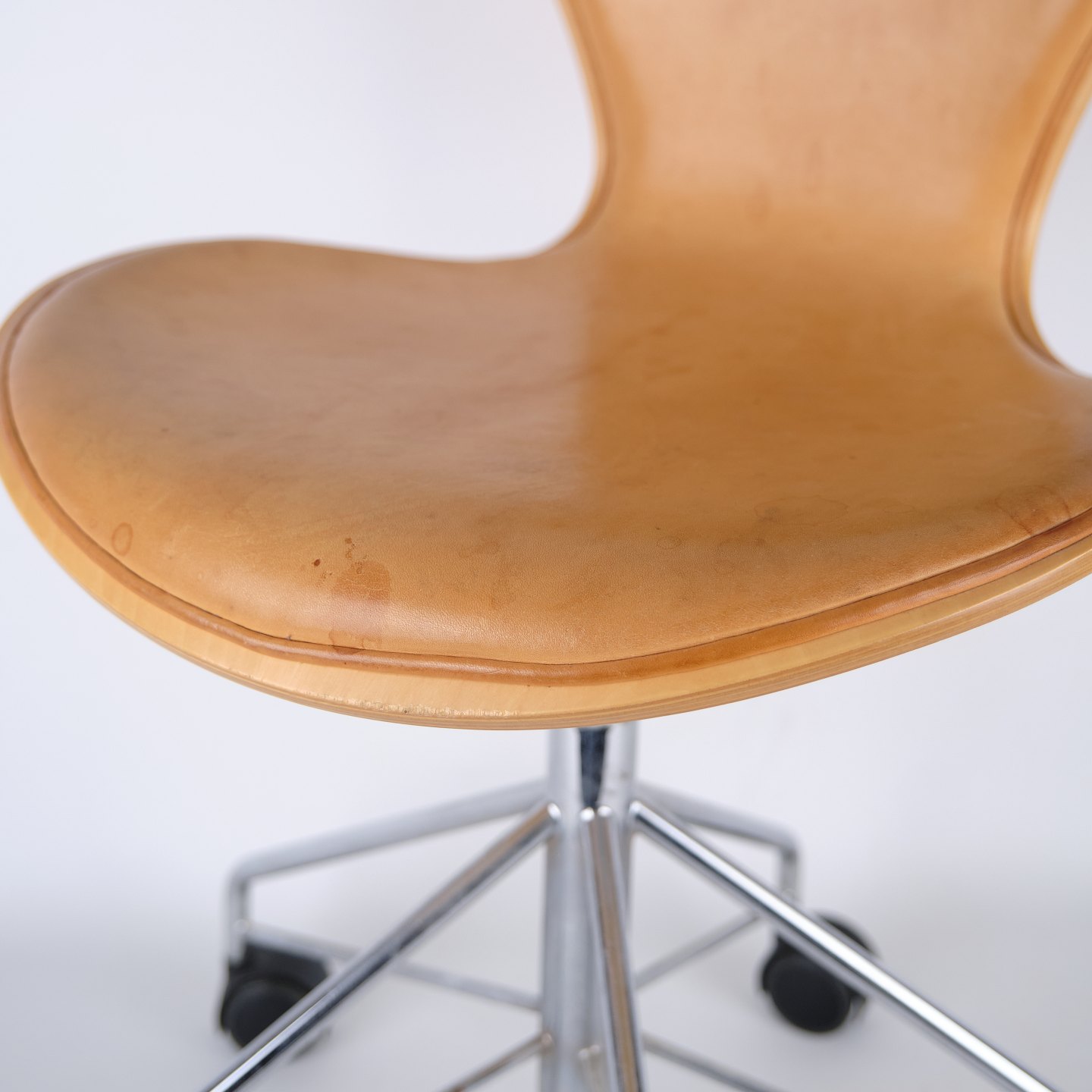 Arne Jacobsen Syver kontorstol, model 3117, for Fritz Hansen. Patineret naturlæder og kromstel med hjul. Klassisk dansk design.— Oprindelse: Danmark
