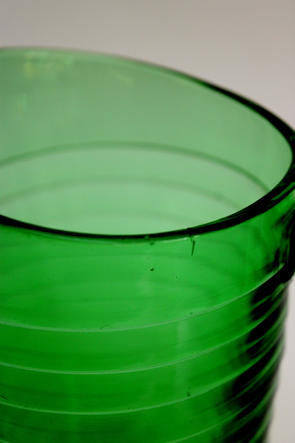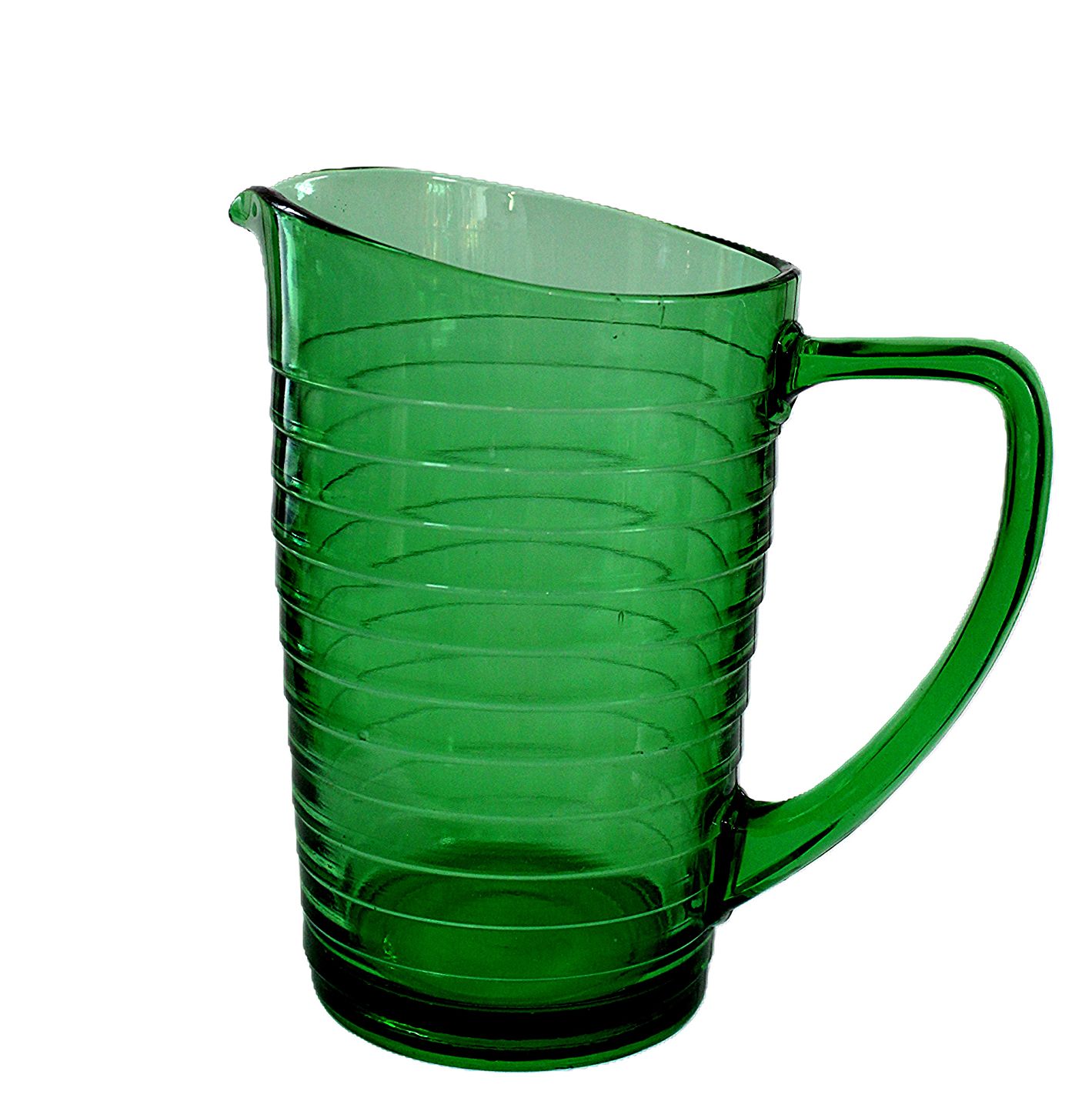 Holmegaard, Broksø presset glas 1938-1941, designet af Jacob E Bang. Transparent grøn kande. Højde 17 cm. Længde 17 cm. Produktions fejl "revne" i kanten. Pris: 175 kr. stk. Lager: 1 Udstiller