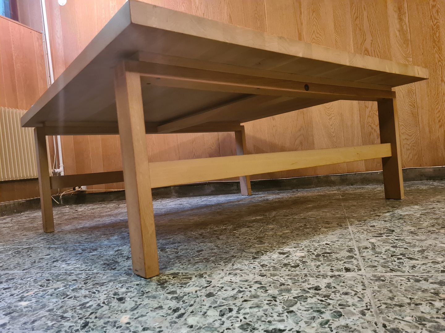 Kvadratisk sofabord fra 1970´erne i massiv eg. Formgivet hos Laboremus i Viborg. Fremstår pænt og velholdt uden nævneværdige brugsspor.Højde 50 cm. Længde 120 cm. Bredde 120 cm.