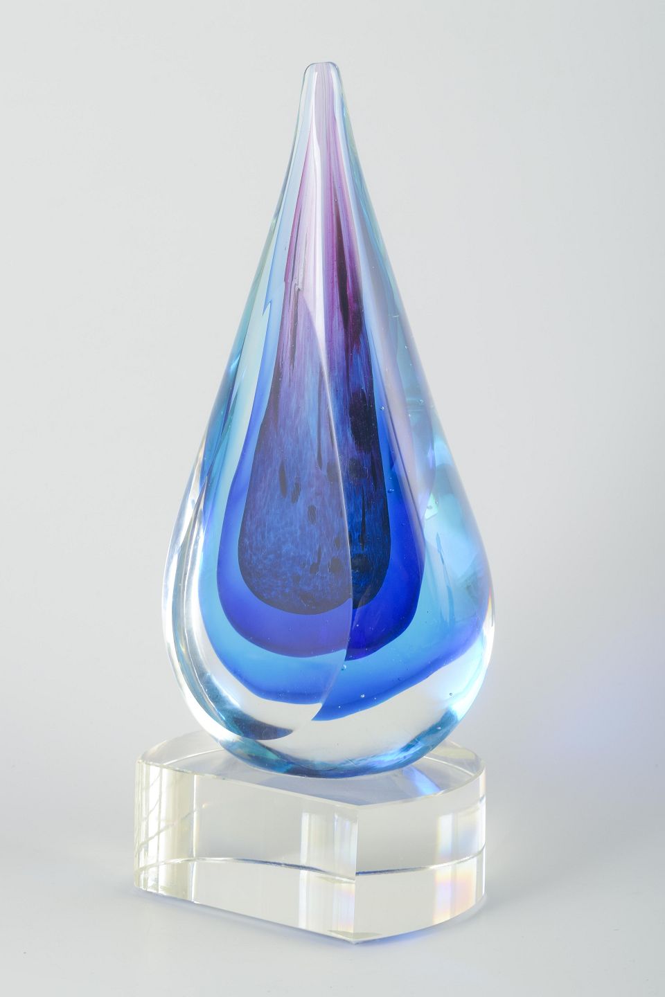 Handmade sculpture in clear and blue-violet glass, shaped as a drop with optical layers and an elegant pointed top. Mounted on a round clear-glass base.