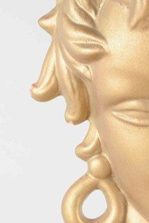 Italiensk vægrelief, kvindehoved, 1950’erne.Dekorativt vægrelief i terrakotta, formet som et stiliseret kvindehoved med store øjne, bølget hår og ringformet ørering. Overfladen er bemalet med gylden dekor. Signeret.