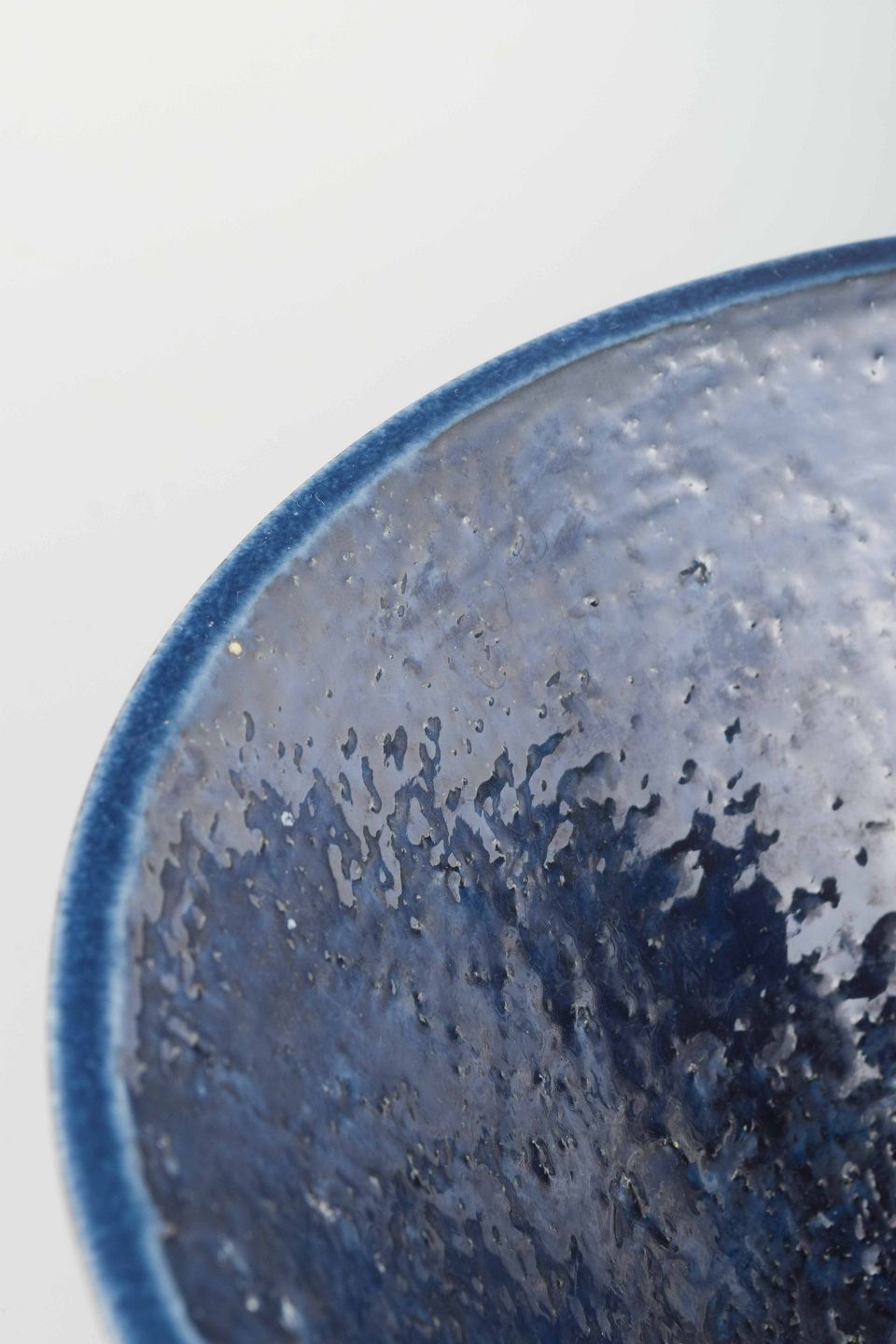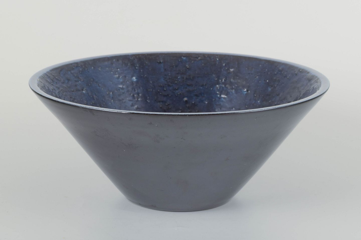 Konisk formet skål i stentøj med dyb, mørkeblå glasur med let krystallinsk struktur.