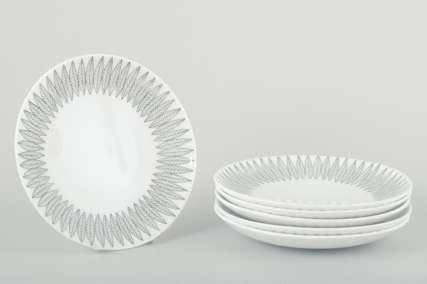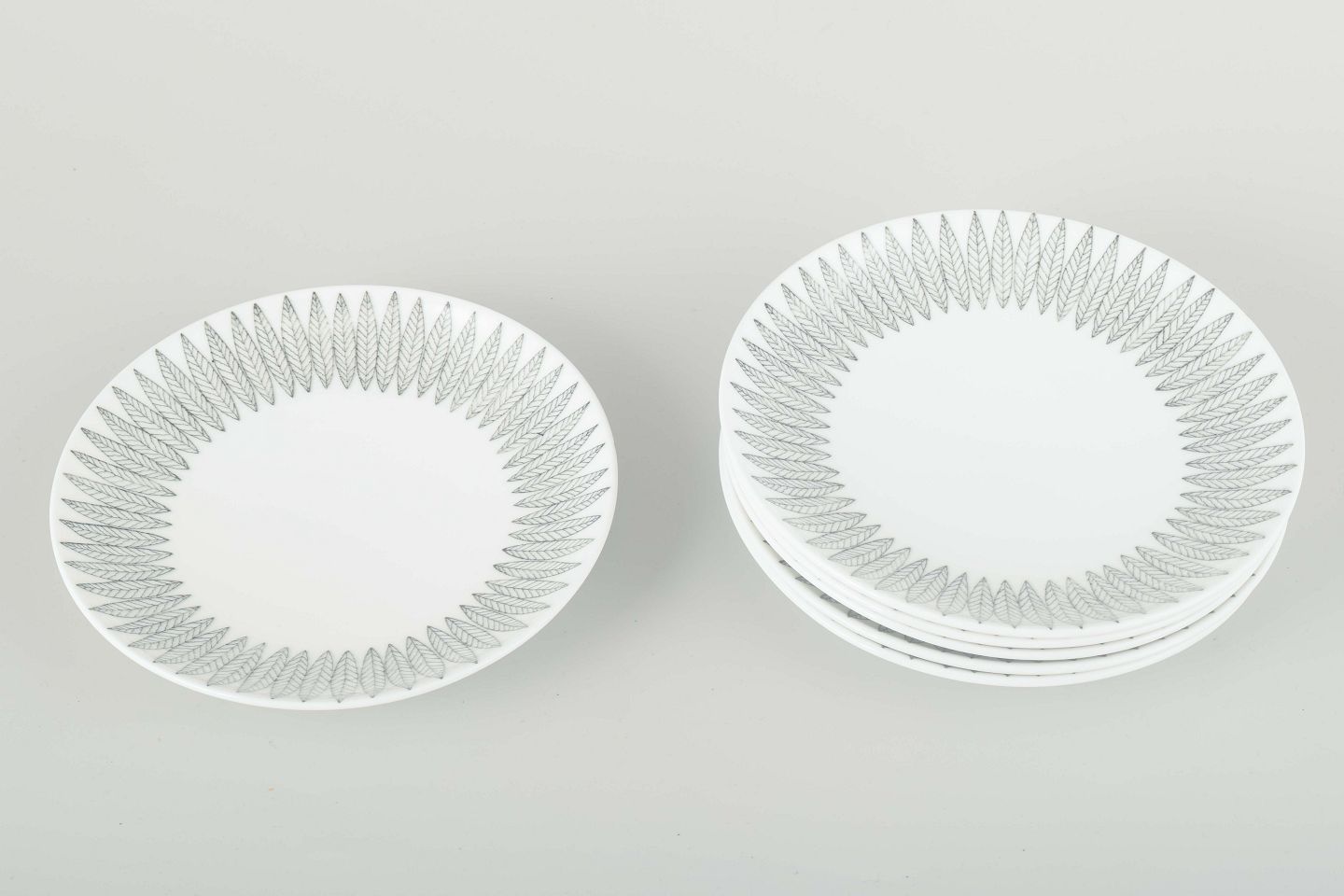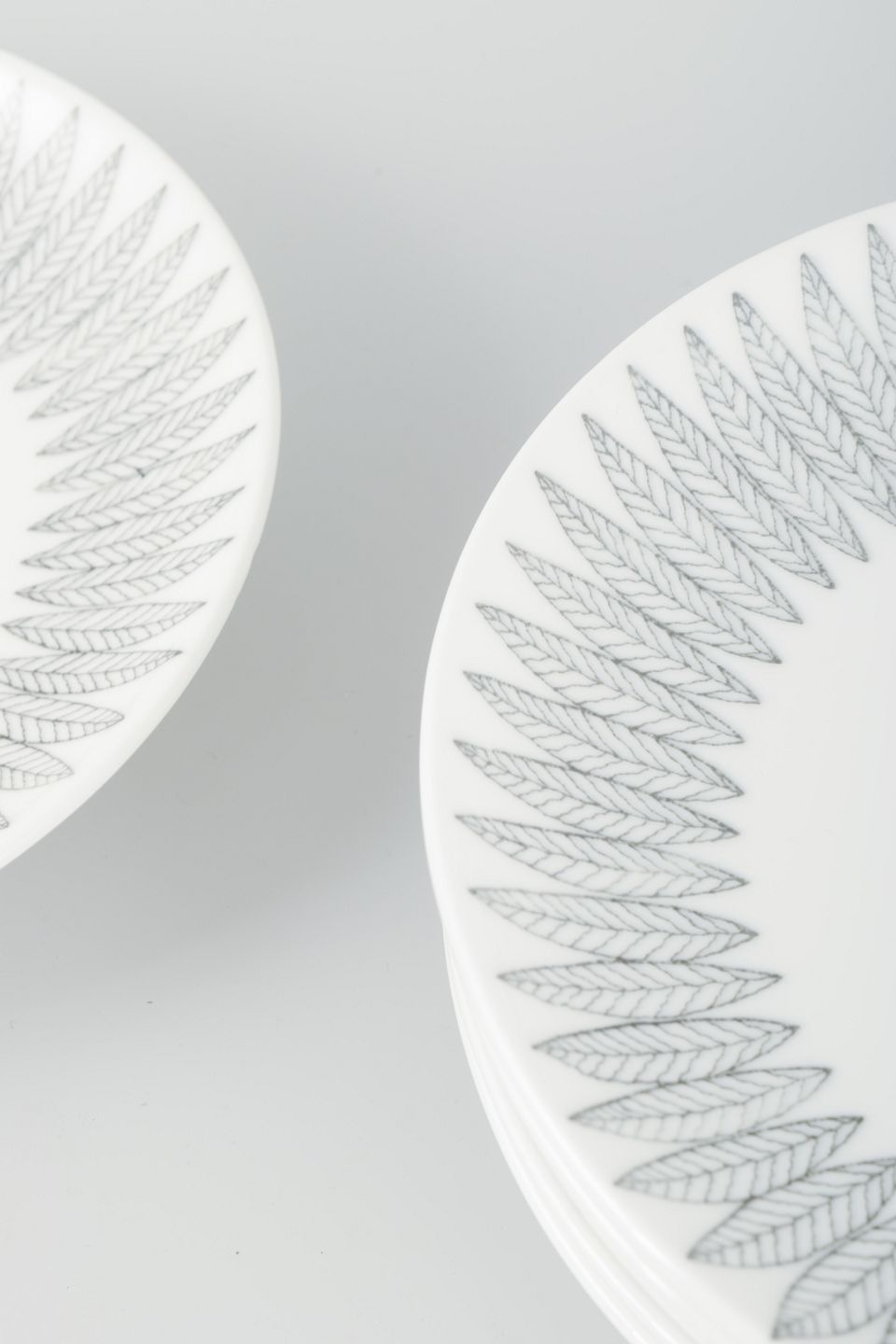 Sæt på seks kagetallerkener i fajance med det karakteristiske “Salix”-mønster i grå på hvid bund, designet af Stig Lindberg.