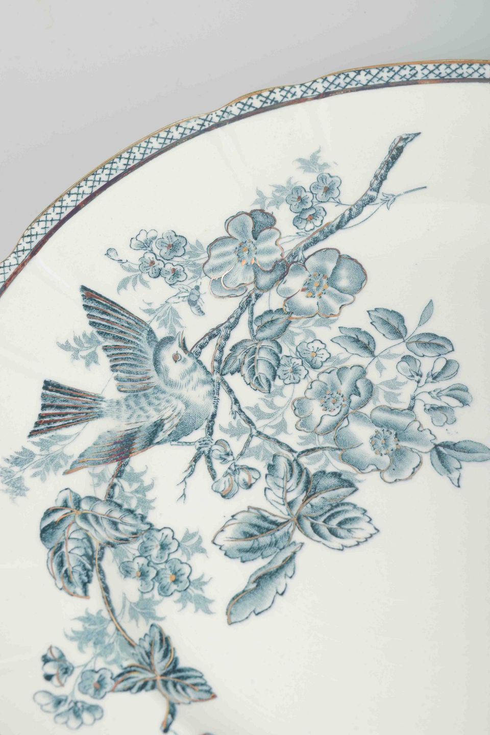 Seks middagstallerkener i fajance med trykt dekoration af fugl og blomstergren i blågrønne nuancer samt dekorativ bort langs kanten.