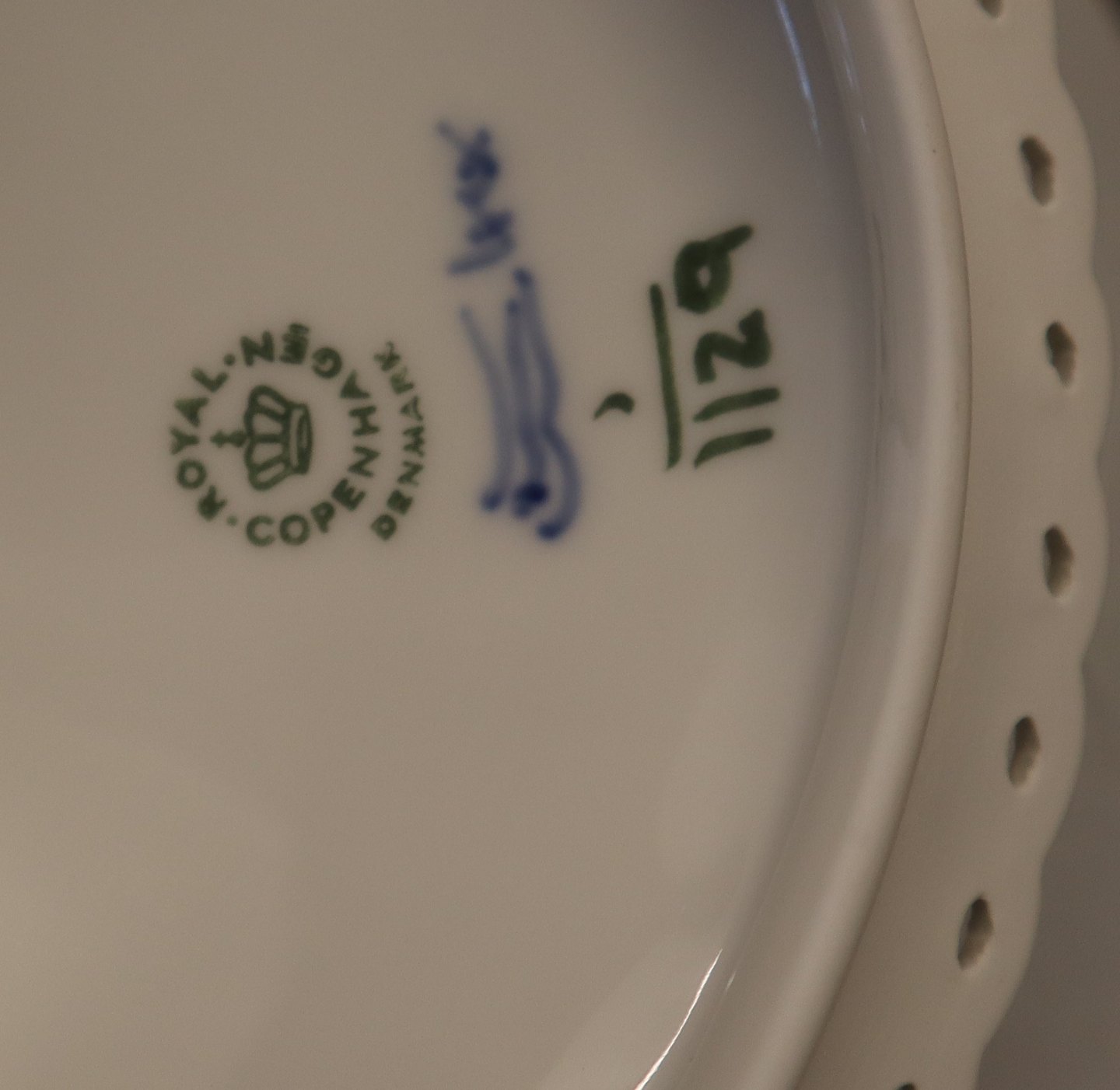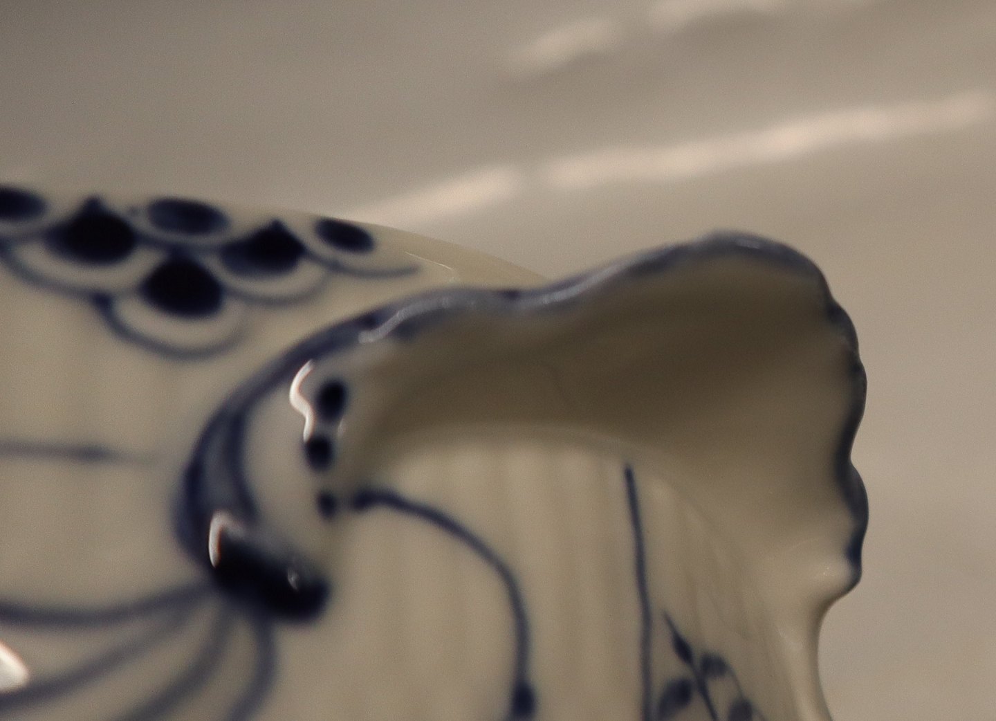1 stk på lager 1. sortering minimalt skår på hank ellers fejlfri1129-1 Ragoutfad/lågfad, ovalt med hanke ca 16 x 27.5 cm Kongelig Dansk Porcelæn Musselmalet Helblonde I fin og hel stand