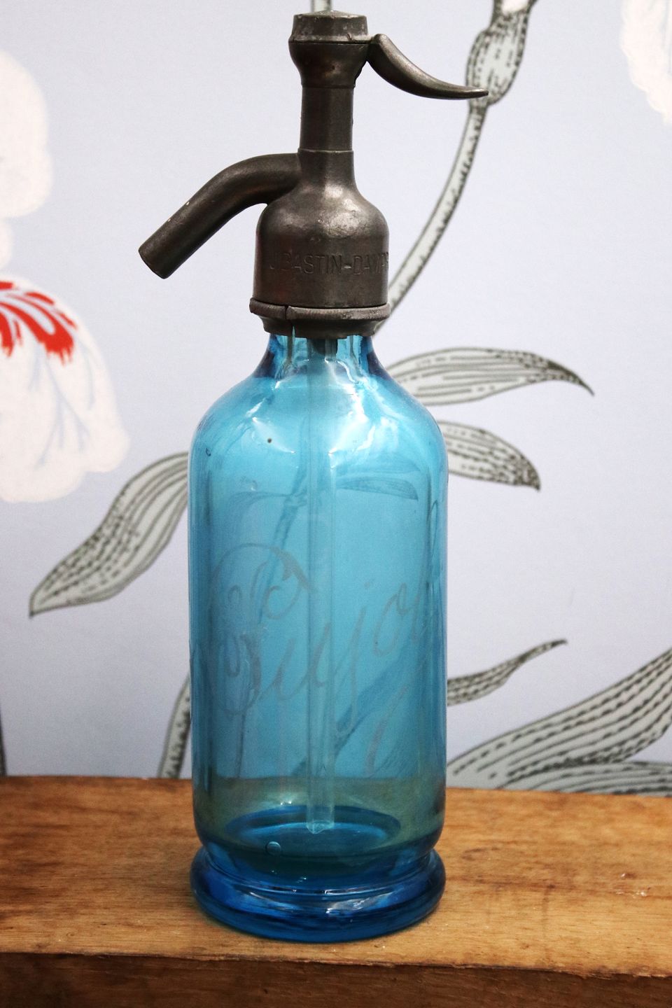 Dekorativ , sjælden fransk mini glas sifonfra begyndelsen af 1900 tallet i turkisblå farve