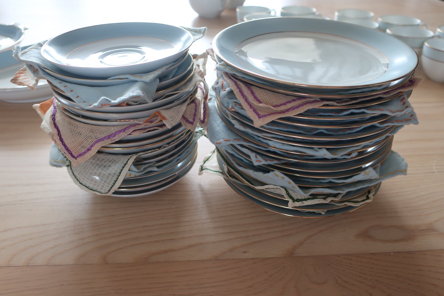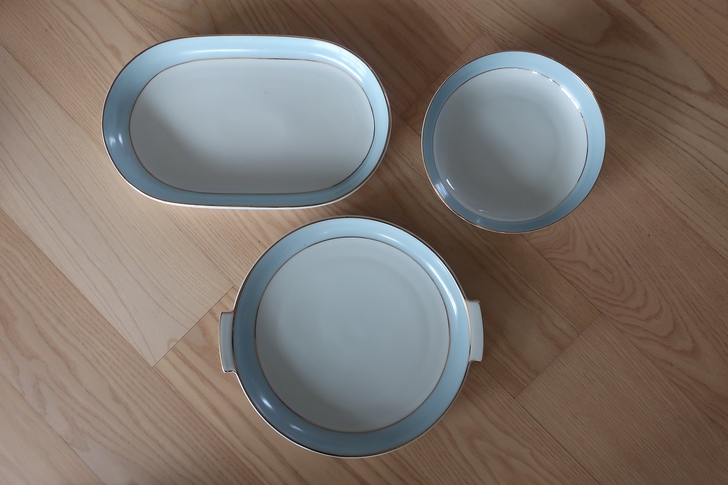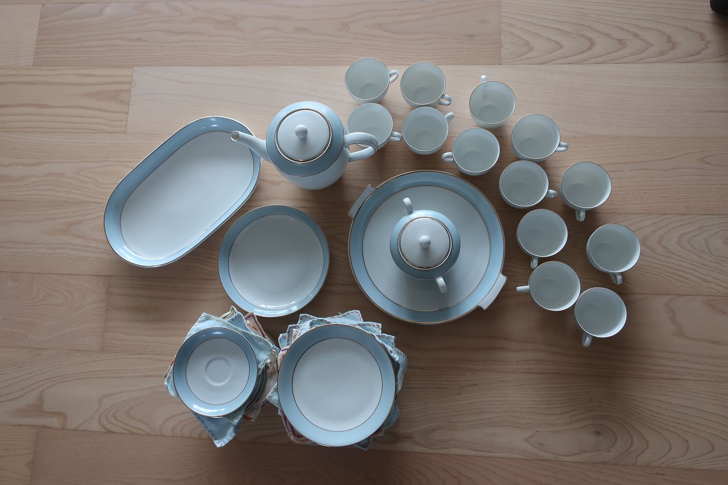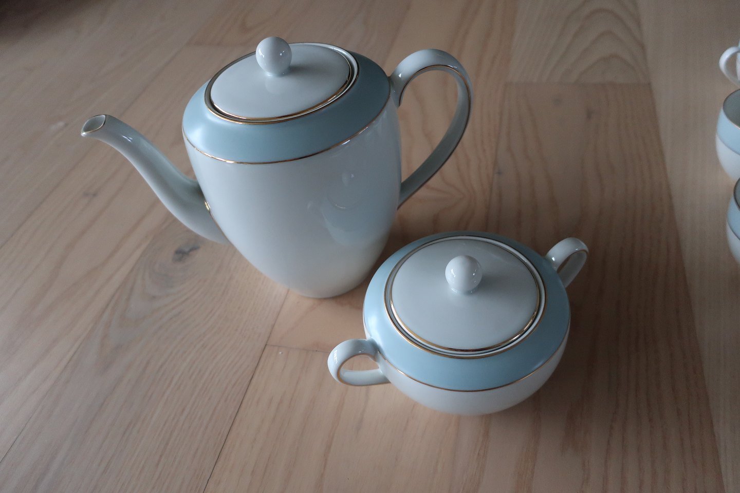 Sjældent kaffestel fra Arzberg, i alt 52 deleEt dejlig lyst og let stel: Hvidt med bred lys blå kant samt 2 guldstriber