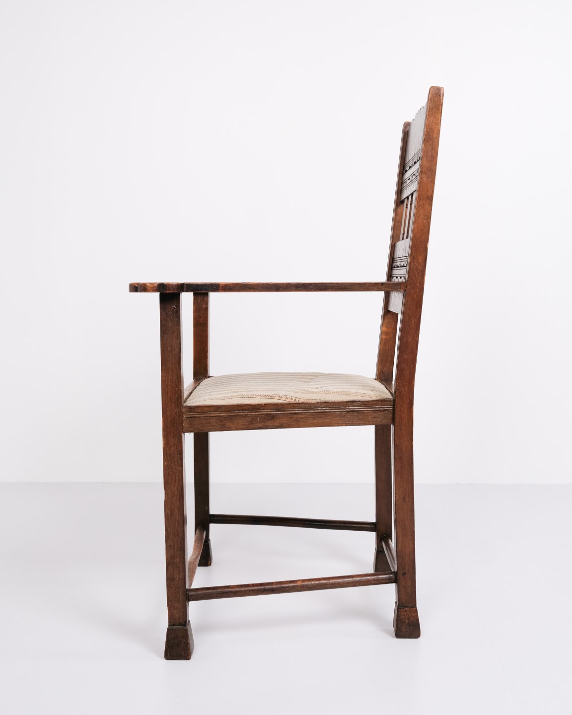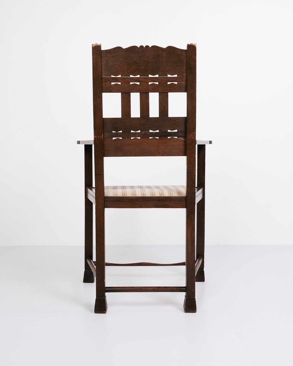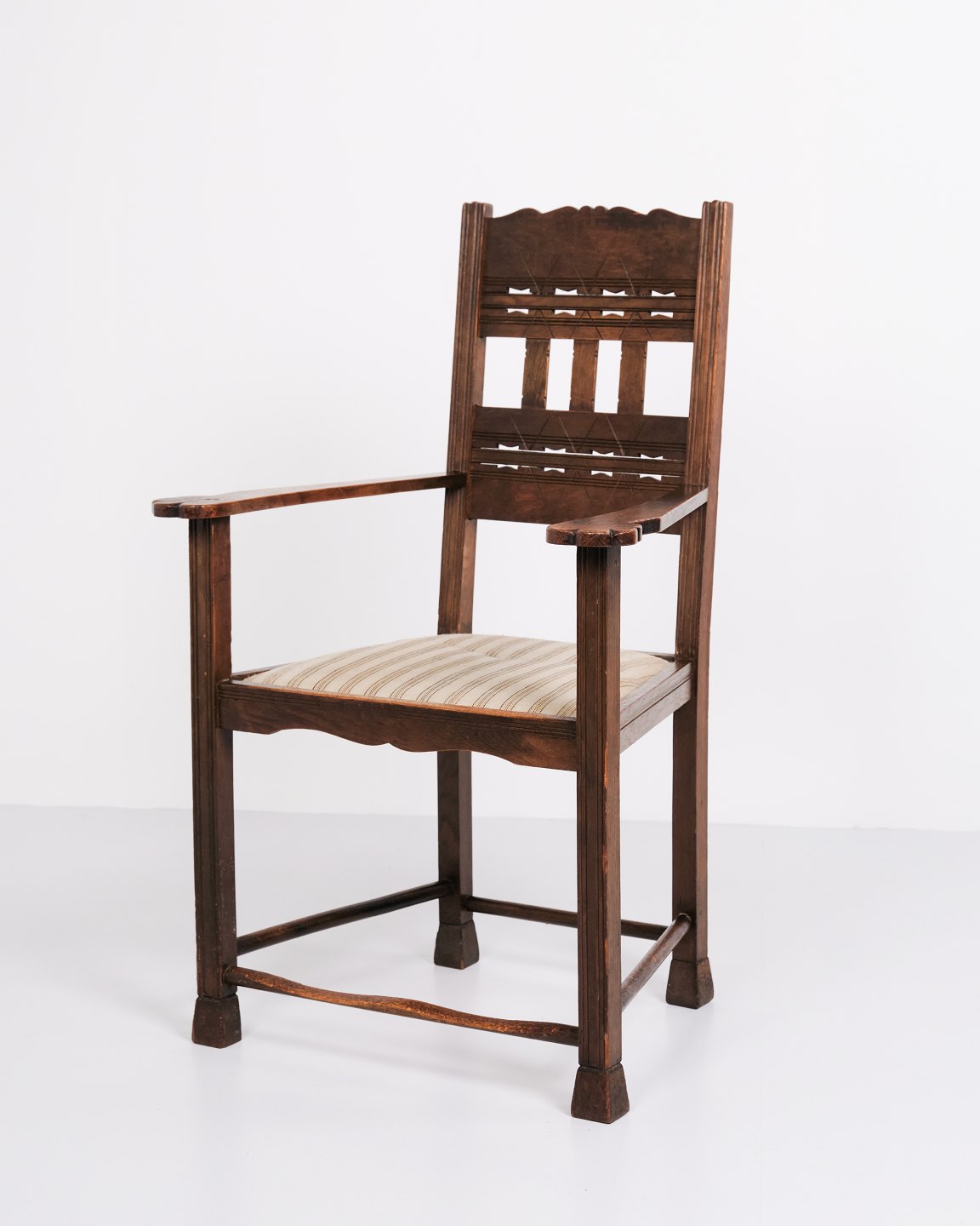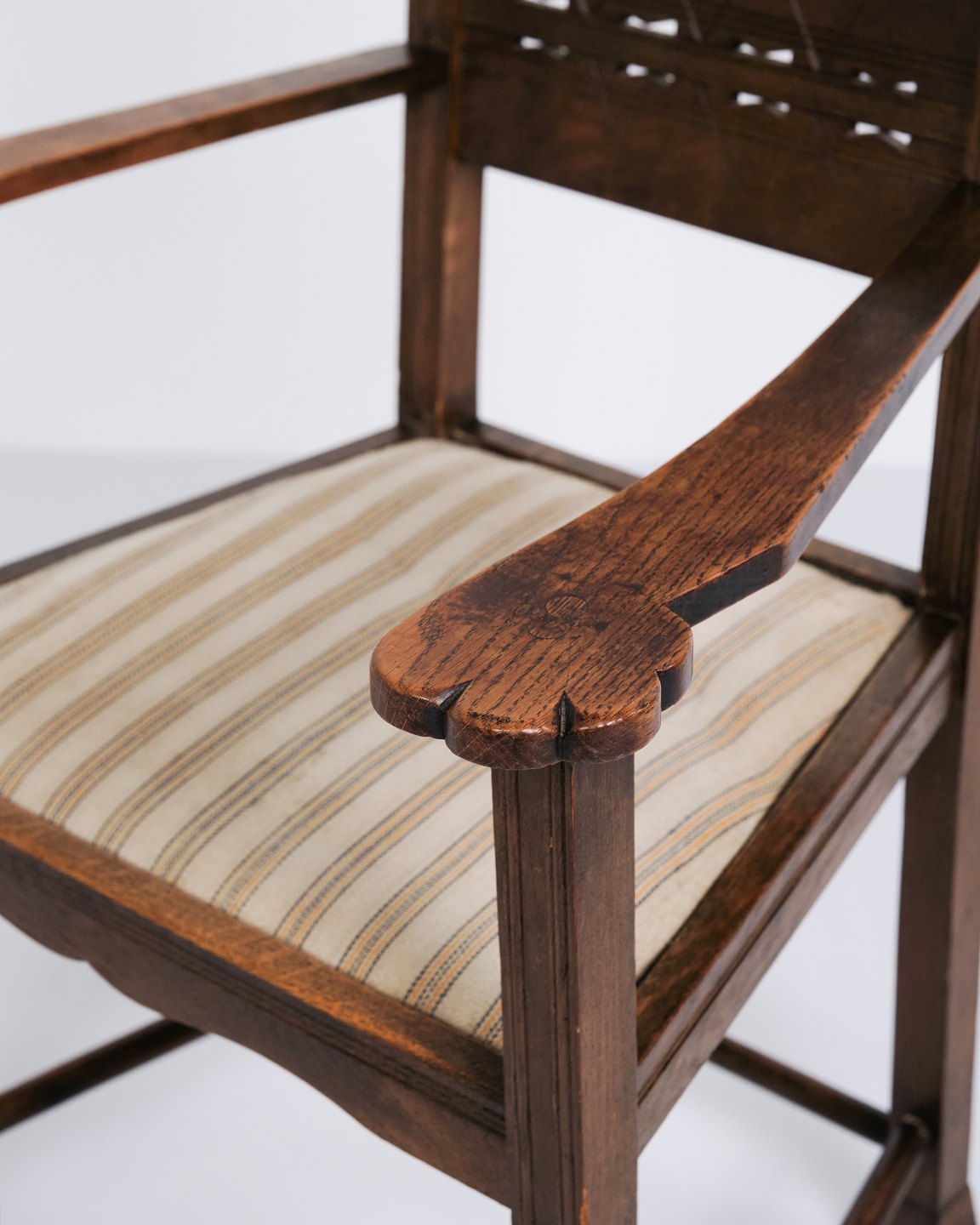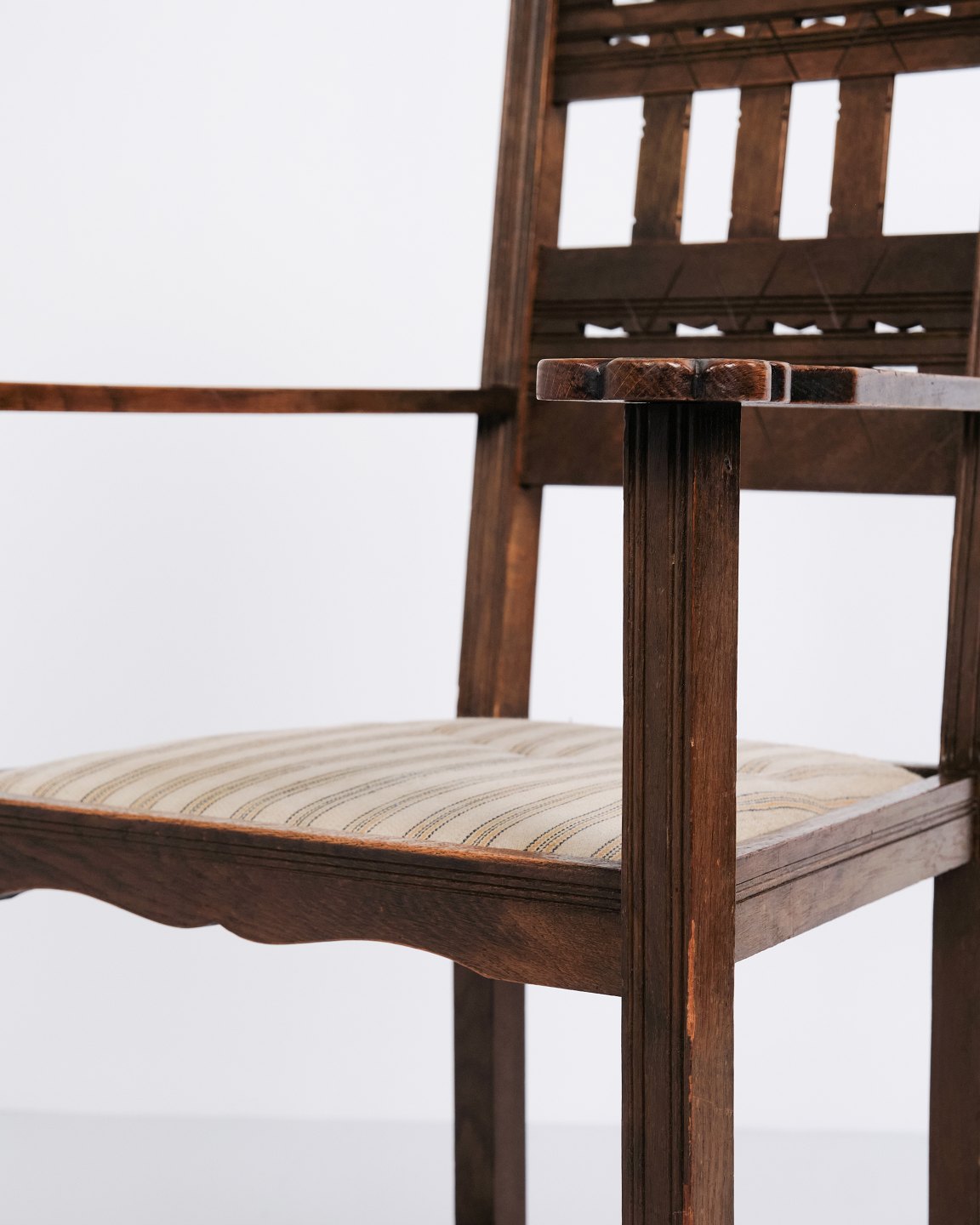 Antik armstol i egetræ fra 1930’erne med stribet polstring.— Oprindelse: Danmark / Europa