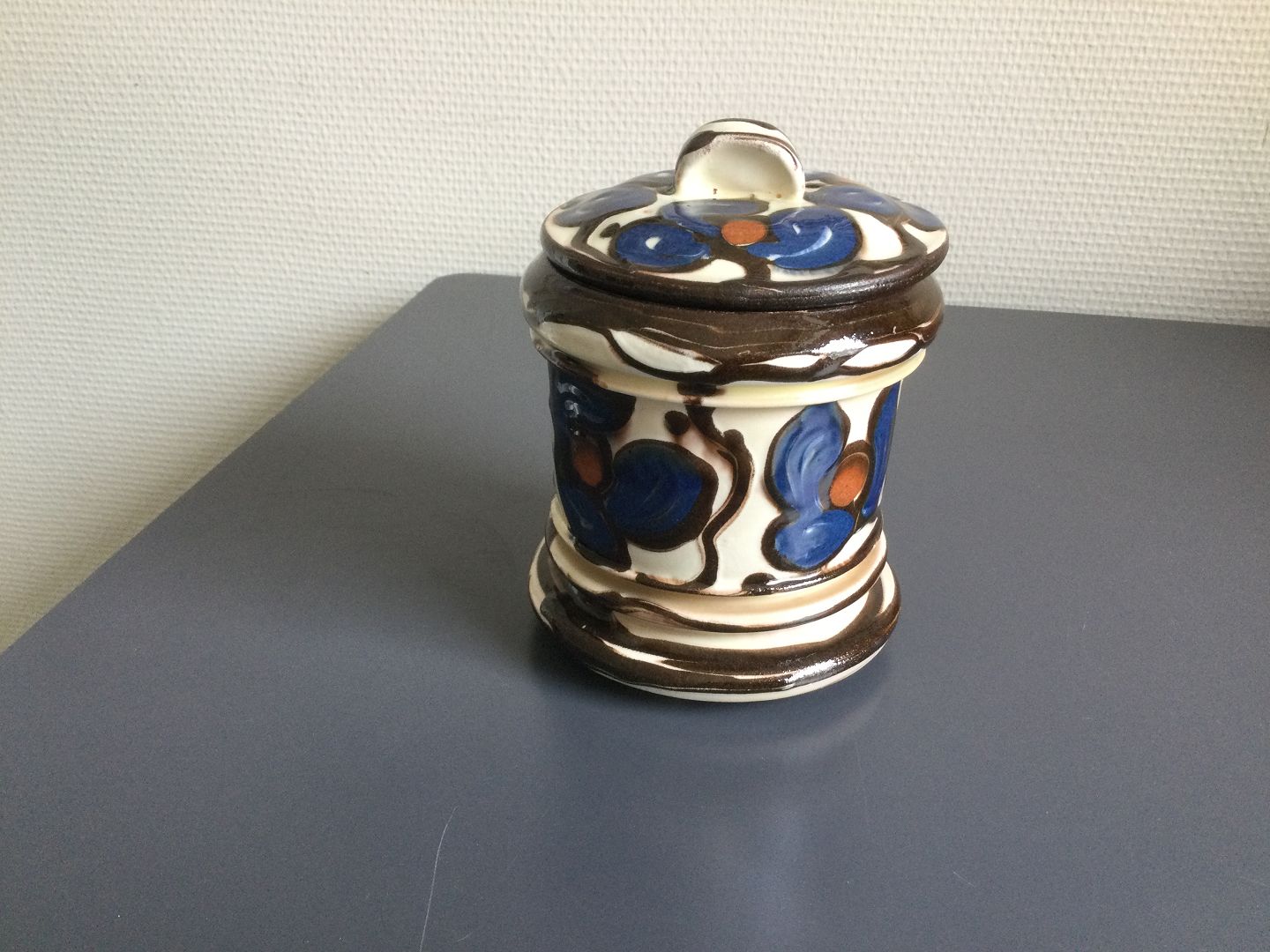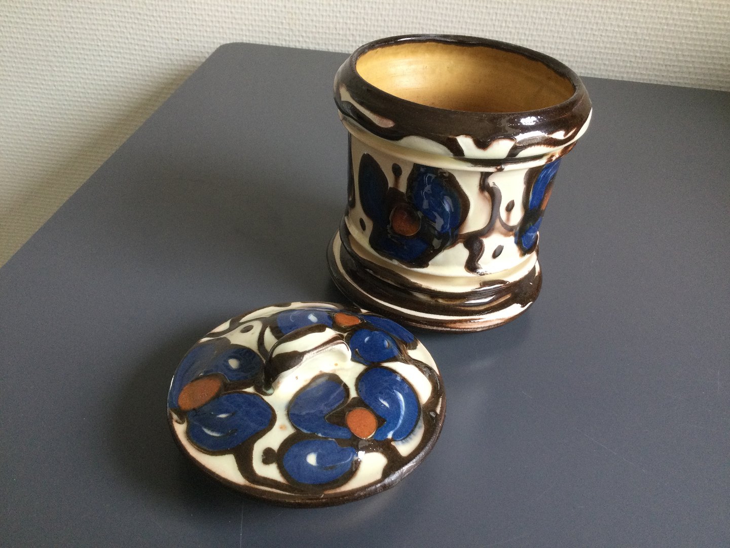 Dekoreret i blåt og brunt med kohornsteknikken.