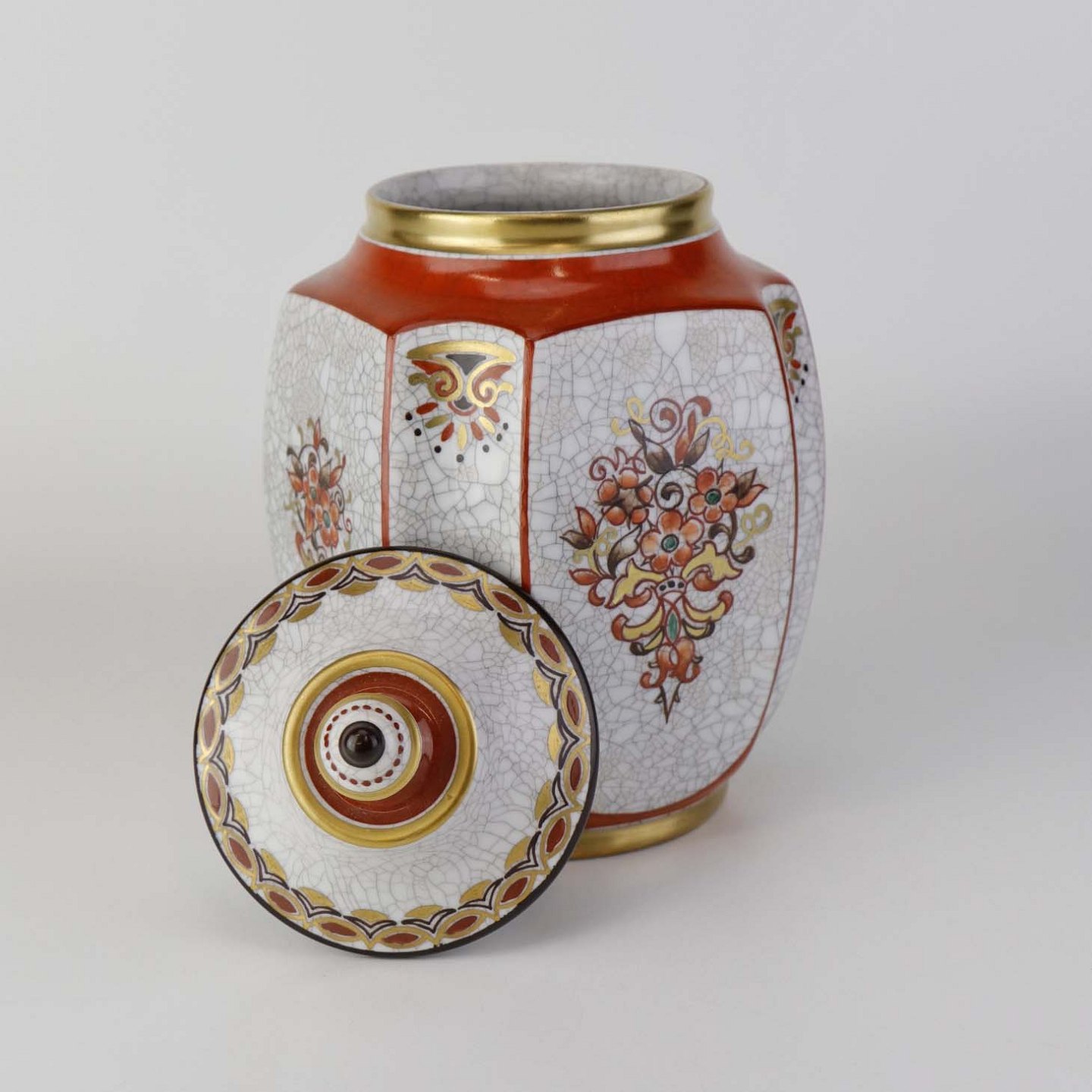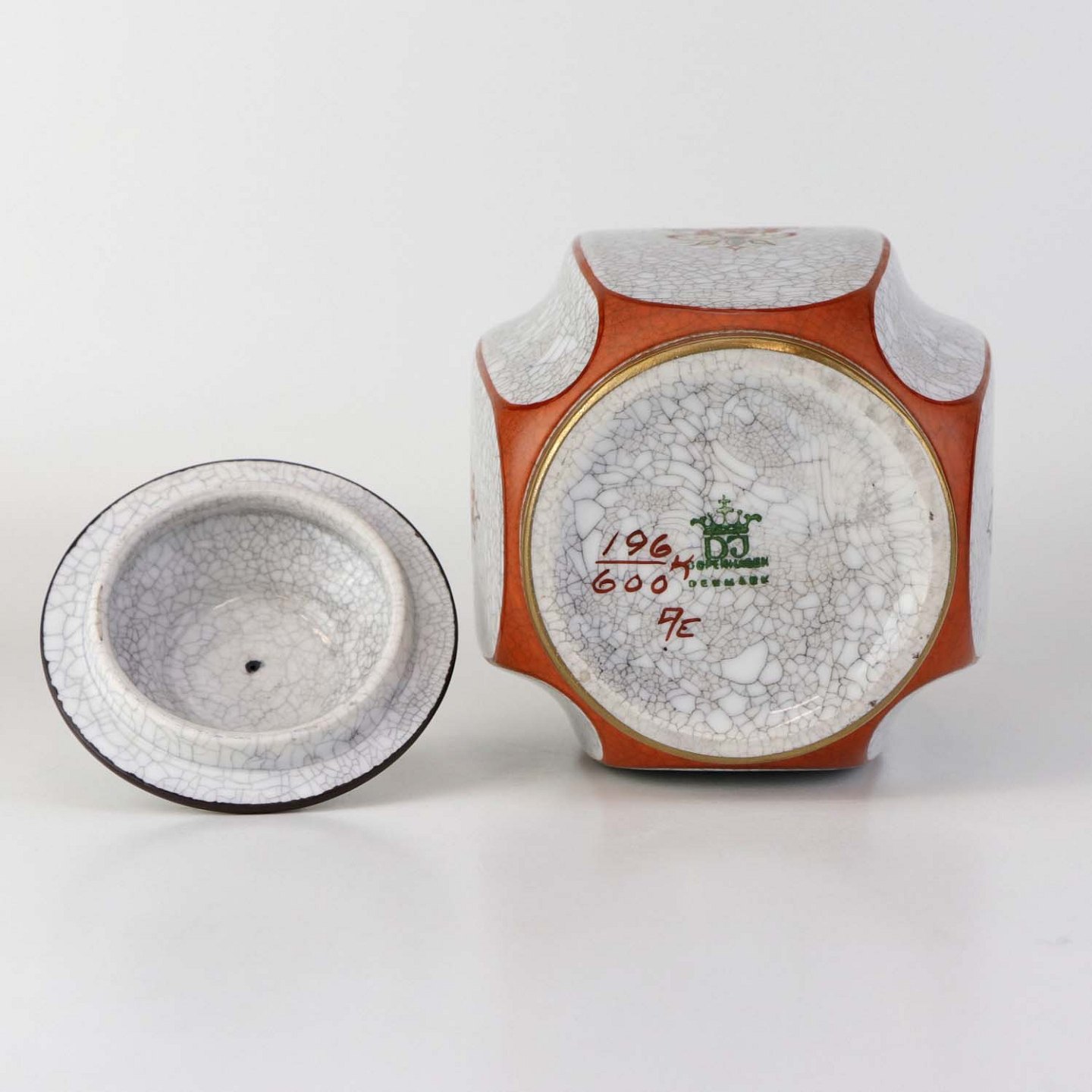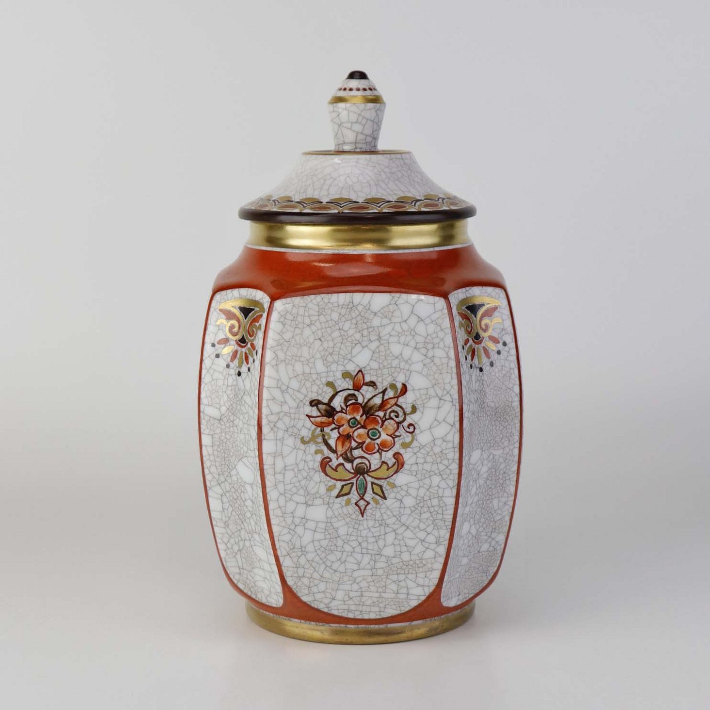 Kantet krukke med låg i porcelæn med krakele glasur og motiv af blomster samt kantet med orangerød bort og guld kant. Nr. 196/600Producent Dahl Jensen