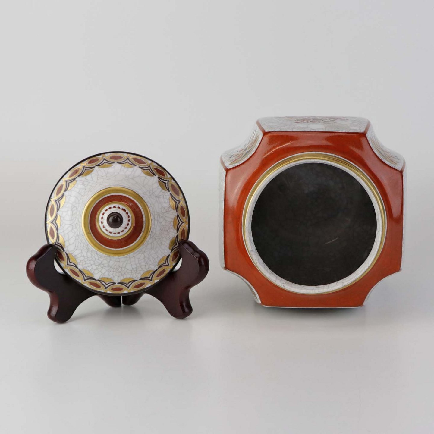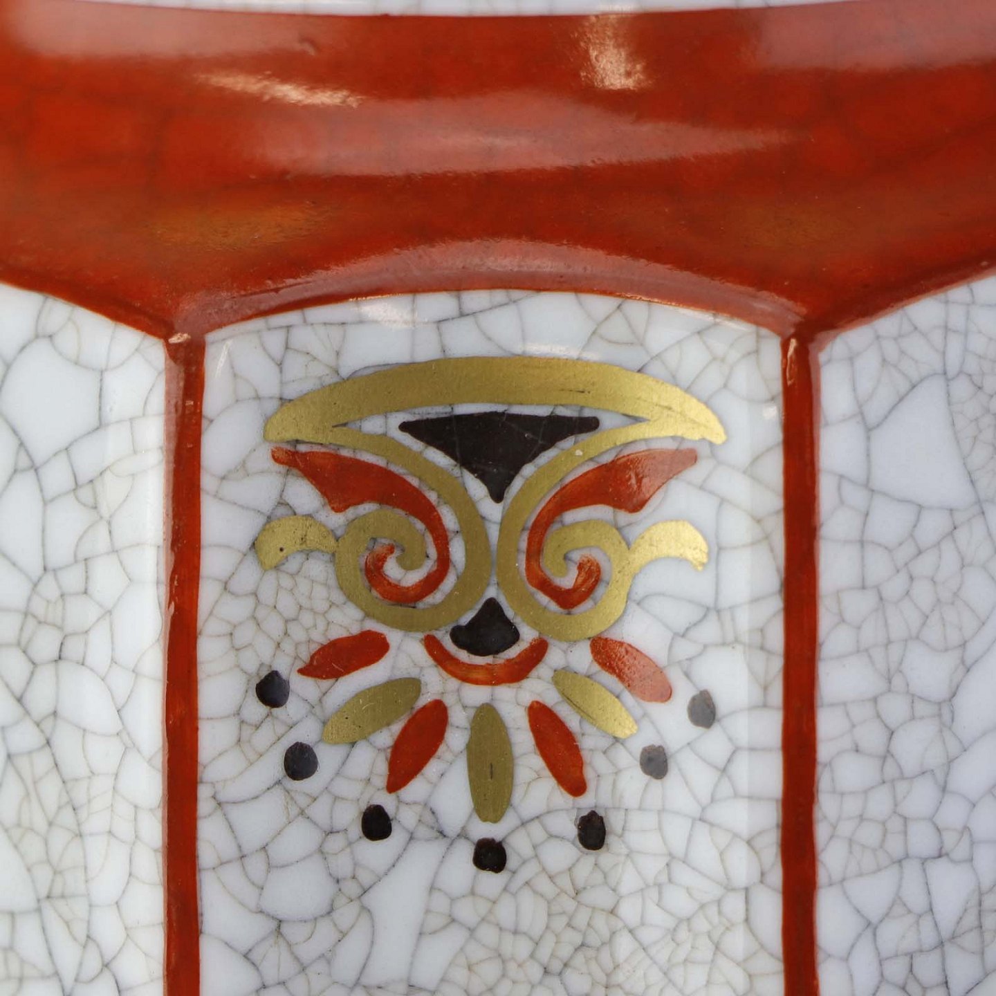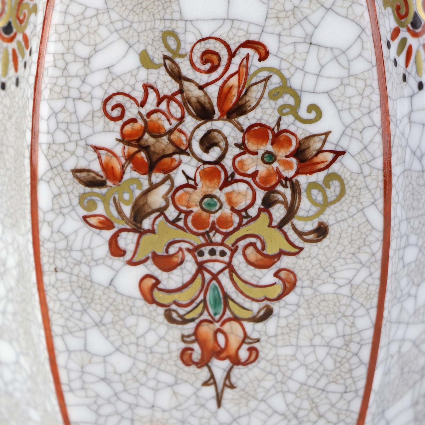 Kantet krukke med låg i porcelæn med krakele glasur og motiv af blomster samt kantet med orangerød bort og guld kant. Nr. 196/600Producent Dahl Jensen