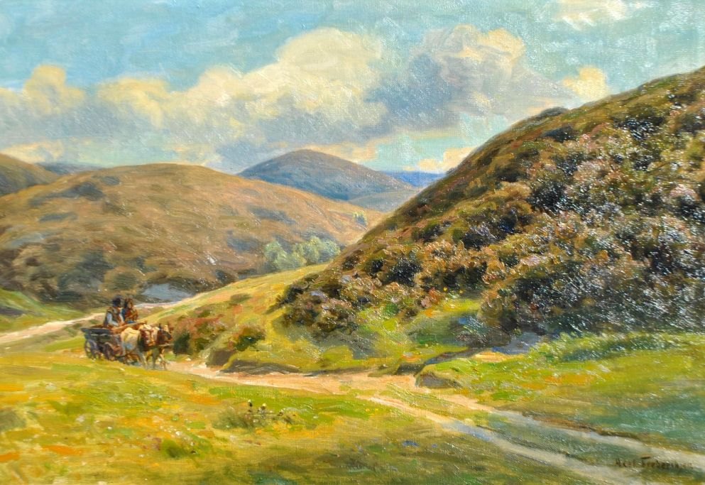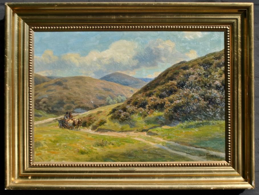 Frederiksen, Axel (1881 - 1961) Danmark: En studetrukket vogn i Rebild Bakker. Olie på lærred. Signeret. 50 x 70 cm.Indrammet: 65 x 88 cm.