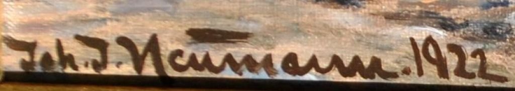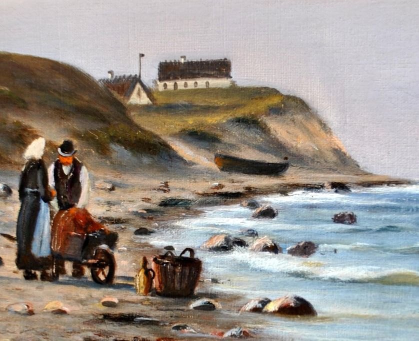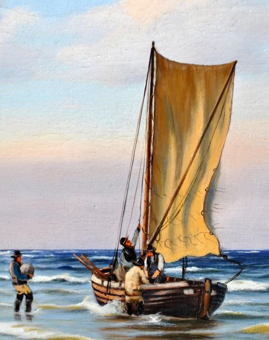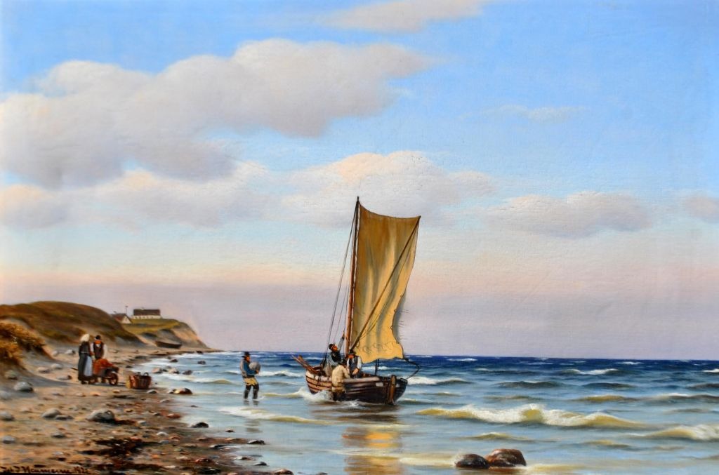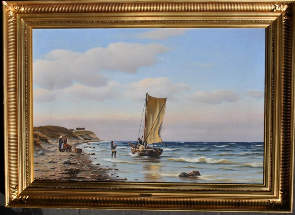 Neumann, Johan (1860 - 1940) Danmark: En fiskerbåd på kysten. Olie på lærred. Signeret 1922. 78 x 101 cm.Indrammet i en hjørne forgyldt ramme: 86 x 121 cm.