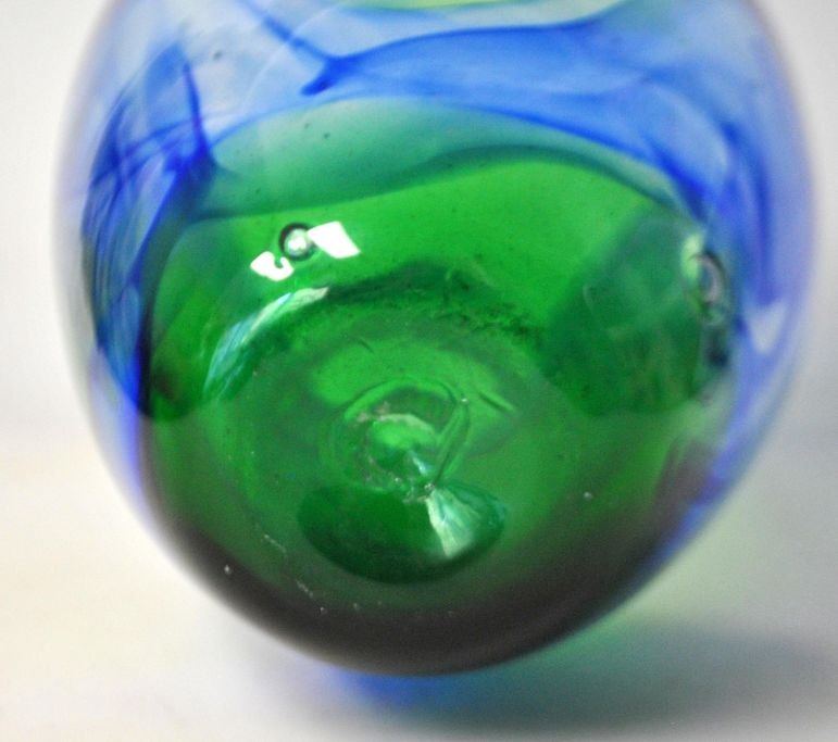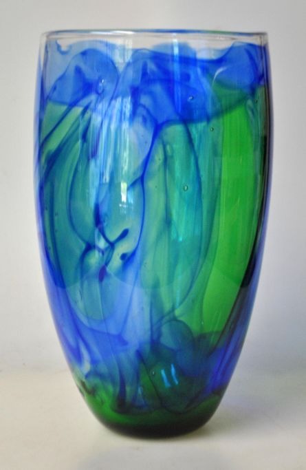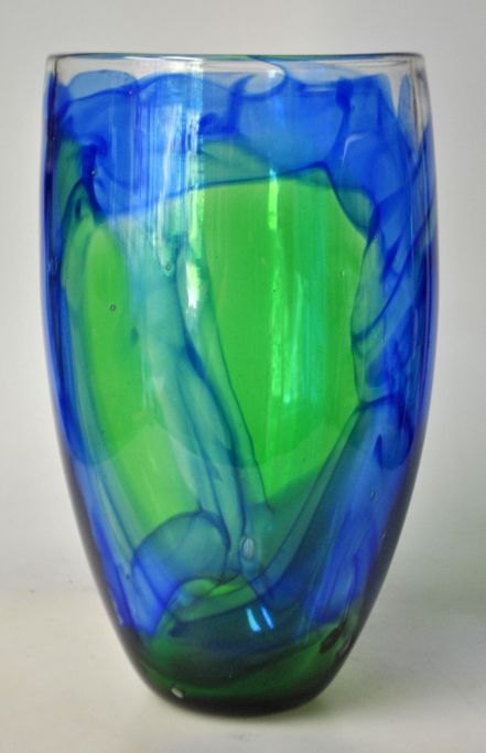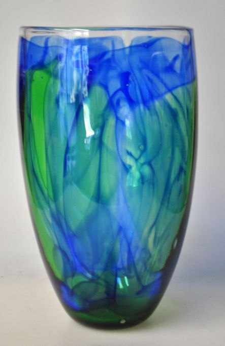 Dansk kunstner (20. årh.): Glasvase i blåt og grønt. Mundblæst. H: 21 cm. Dia: 12 cm.Emne nummer: 28221