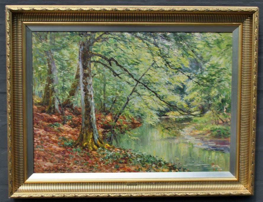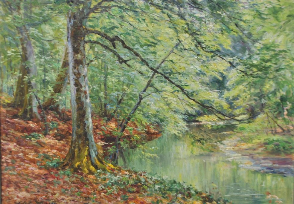 Gyde Petersen, Hans (1862 - 1943) Danmark: Et åløb, forår. Olie på lærred. Signeret. 54 x 75 cm.Indrammet: 70 x 94 cm.