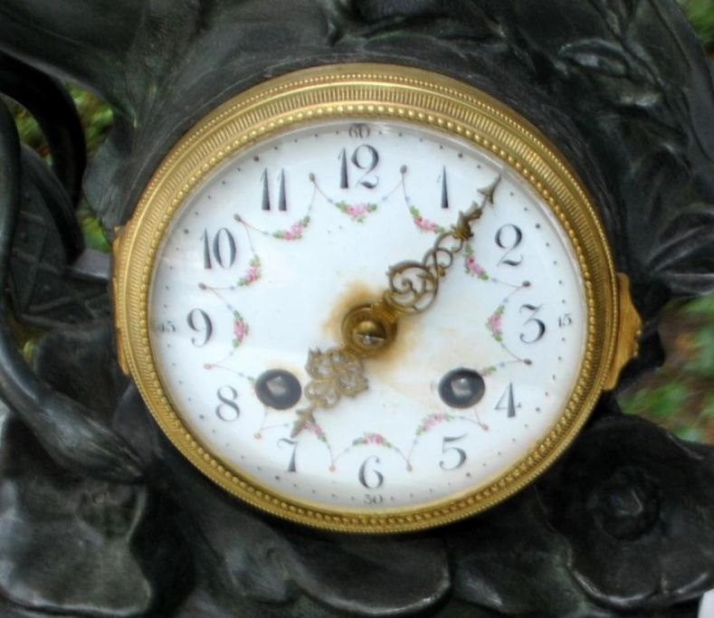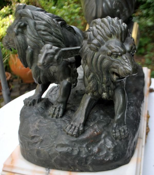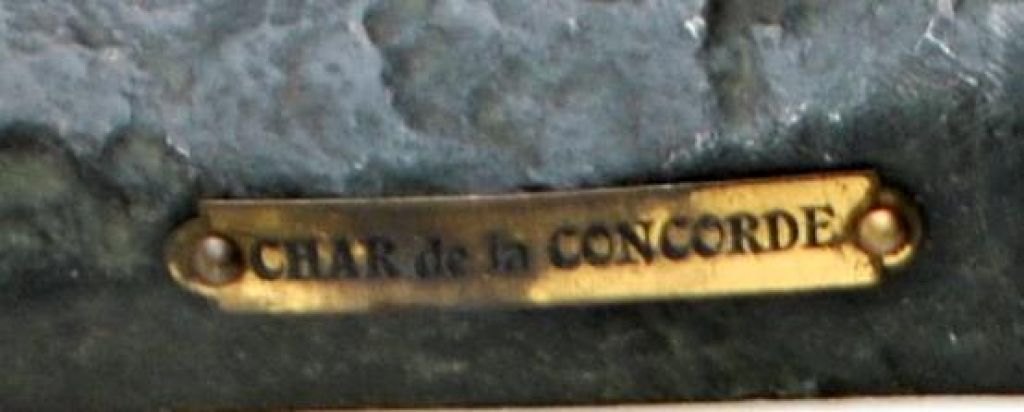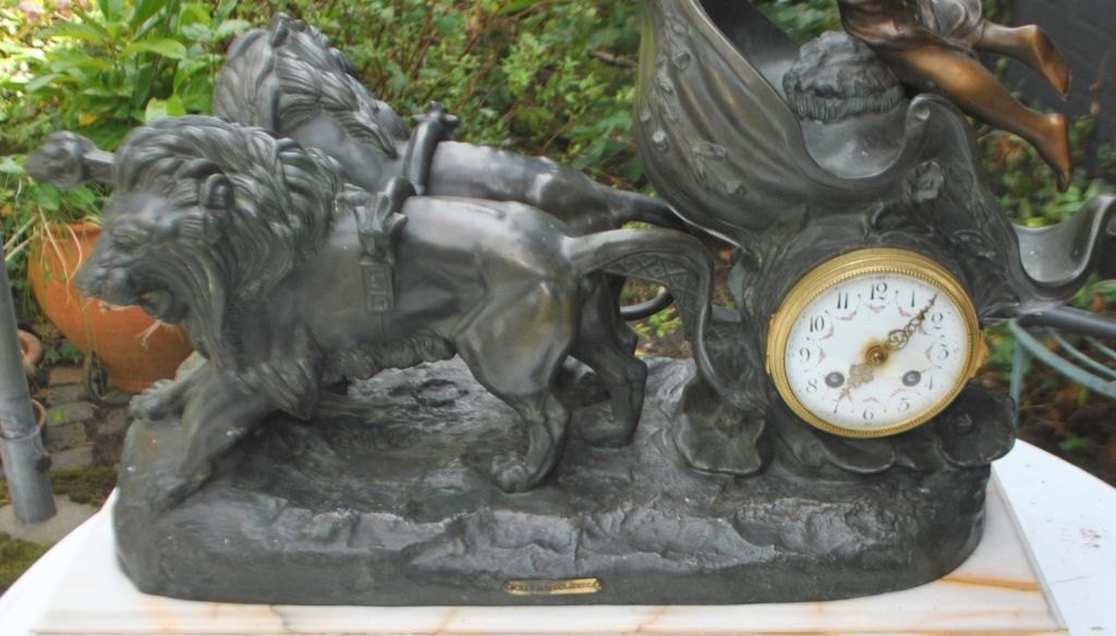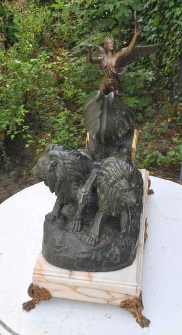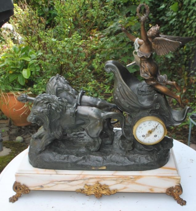 Kæmpe fransk kaminur, 19. årh. Char de la Concorde. Nike - gudinde personificeret som sejren. Zinkur på marmorbase. Nike på stridsvogn trukket af løver. Figurerne er bronzeret.L.: 58 cm. D.: 29,5 cm. H.: 61 cm.