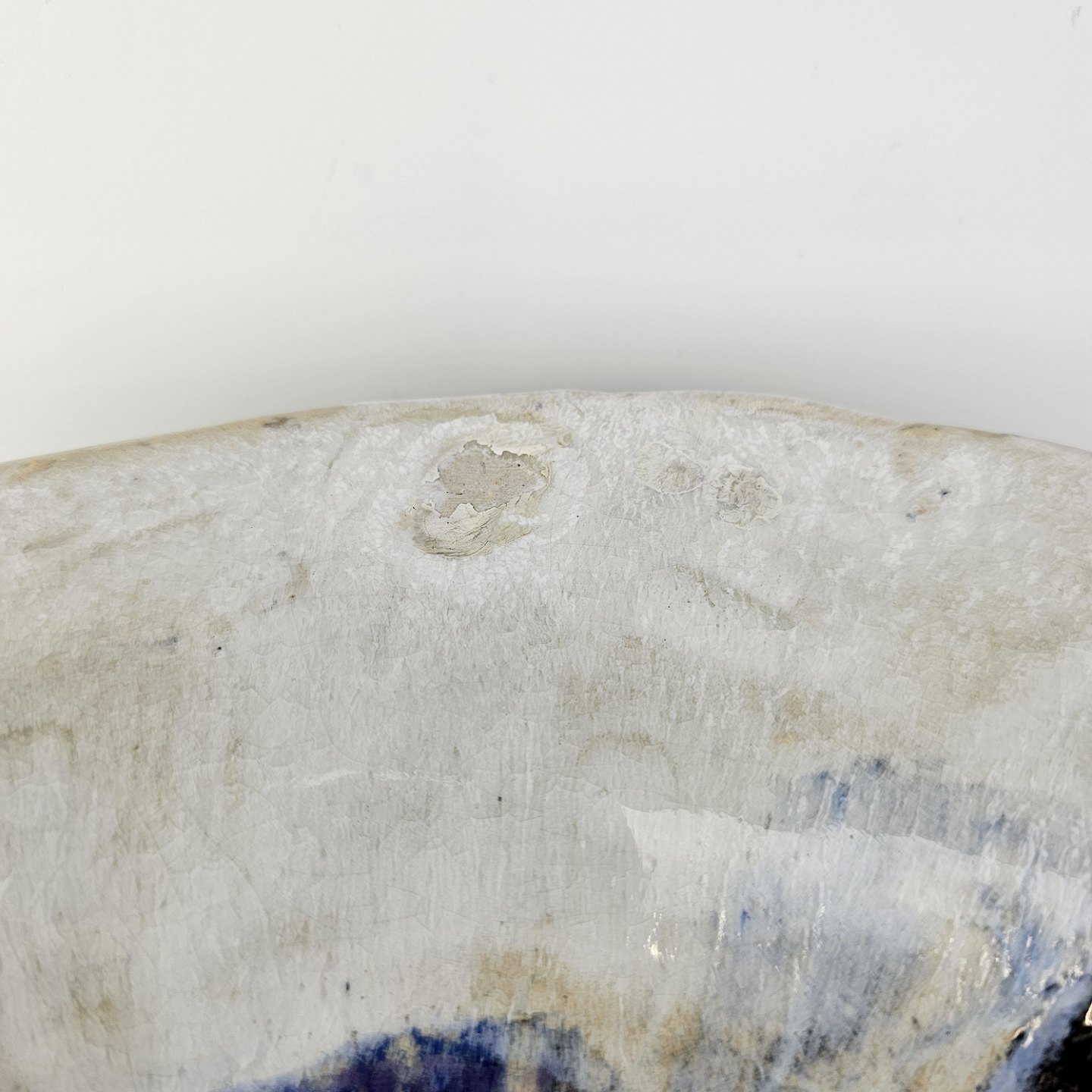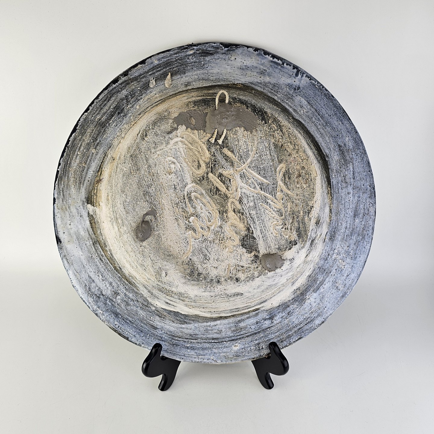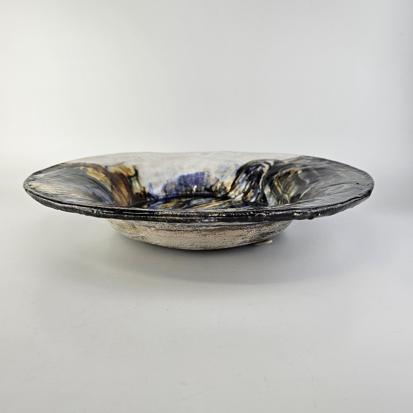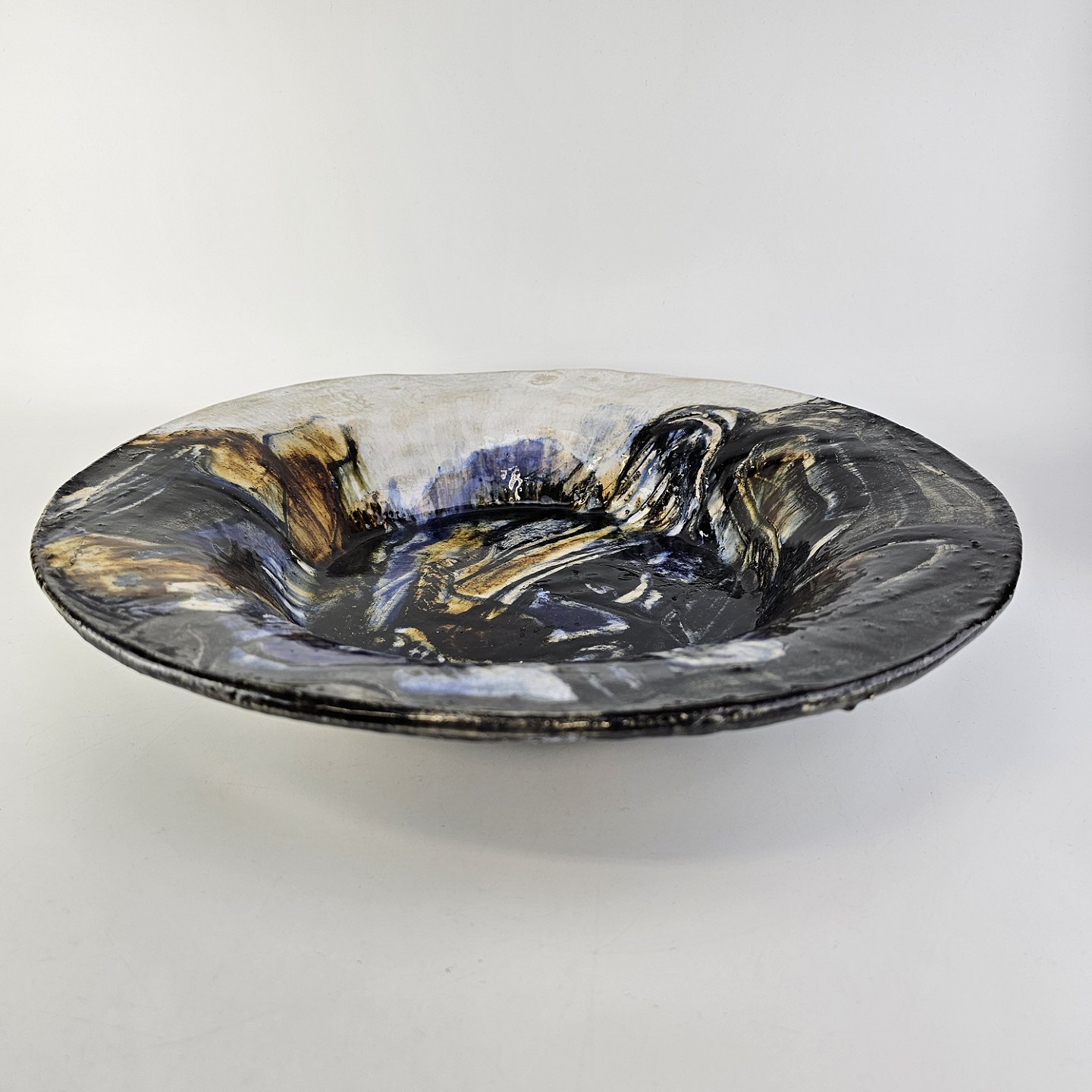 Stort rundt fad i glaseret keramik med abstrakt mønster i sorte, blå og brune nuancerHar snor til ophæng under bunden/på bagsiden