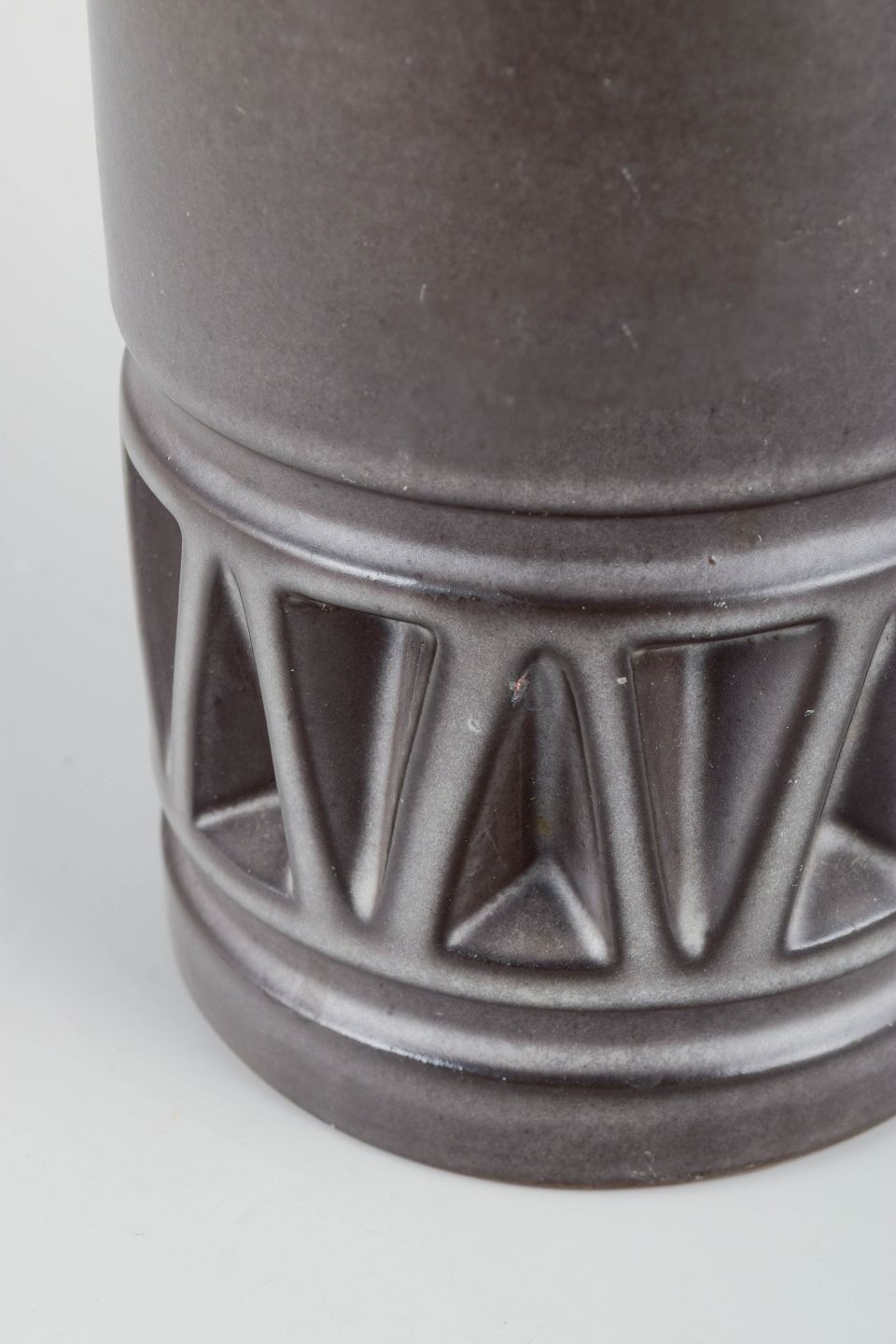 Høj cylindrisk vase i drejet stentøj med håndmalet dekor af stiliserede blomstermotiver i blå og brunlige nuancer.