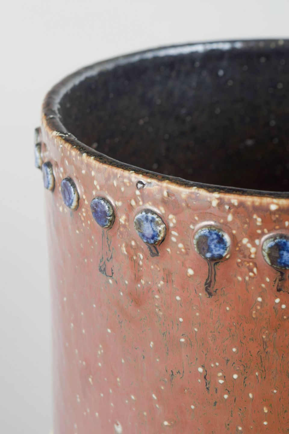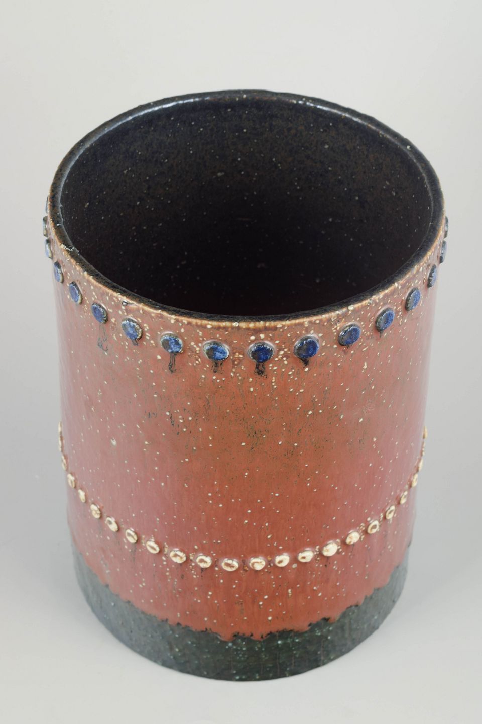 Cylinderformet hånddrejet stentøjsvase med rødbrun glasur, mørk indvendig glasur og dekorative bånd af applikerede blå og lyse keramiske knopper i relief.