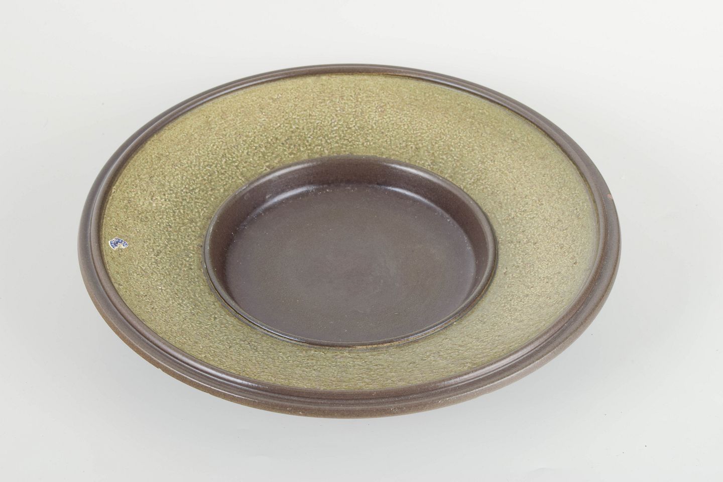 Hånddrejet stentøjsskål med organisk form og dybt tekstureret glasur i dæmpede grønne og brunlige toner, karakteristisk for Simmulsons ekspressive formsprog fra perioden.