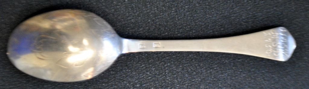 Rococo silver spoon, 1750, probably master Jens Mikkelsen (1723 - ) Aalborg, Denmark. With decorations on the laf, including a rat's tail. Master's stamp. With engraving on the back: HJSK - MSD 1750. L.: 19.5 cm.With signs of wear!
