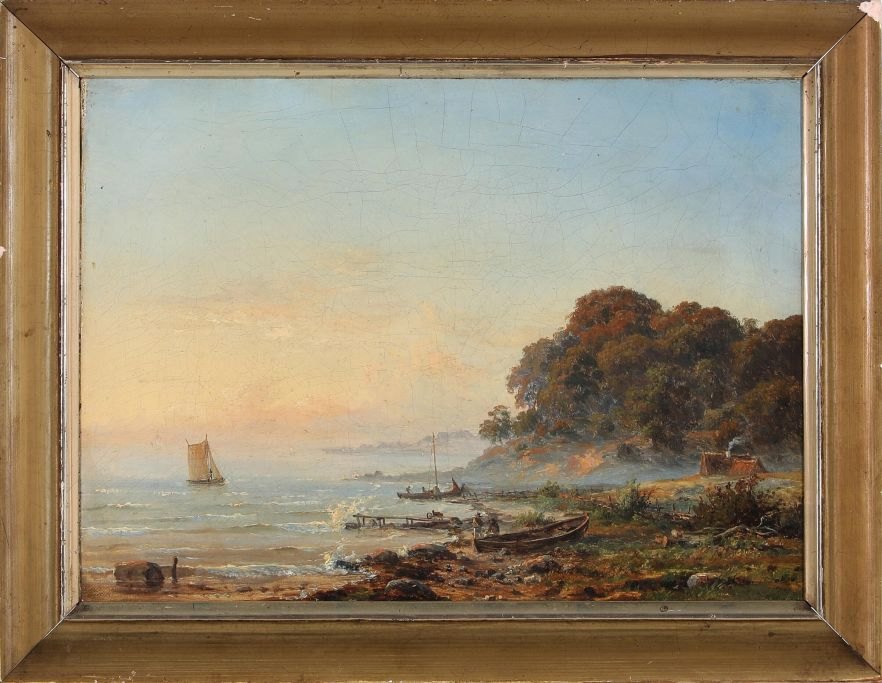 Kiærschou, Frederik Christian (1805 - 1891) Danmark: Fiskerne vender hjem fra havet. Fiskerne vender hjem fra havet. Olie på lærred. Meget svagt signeret.Indrammet: 33,5 x 43 cm. I en antik sølvramme.