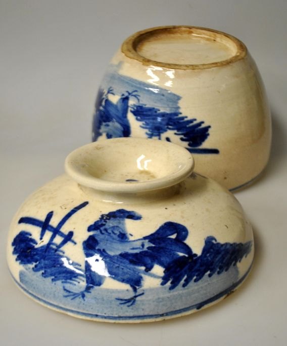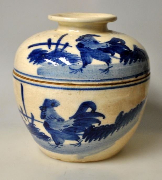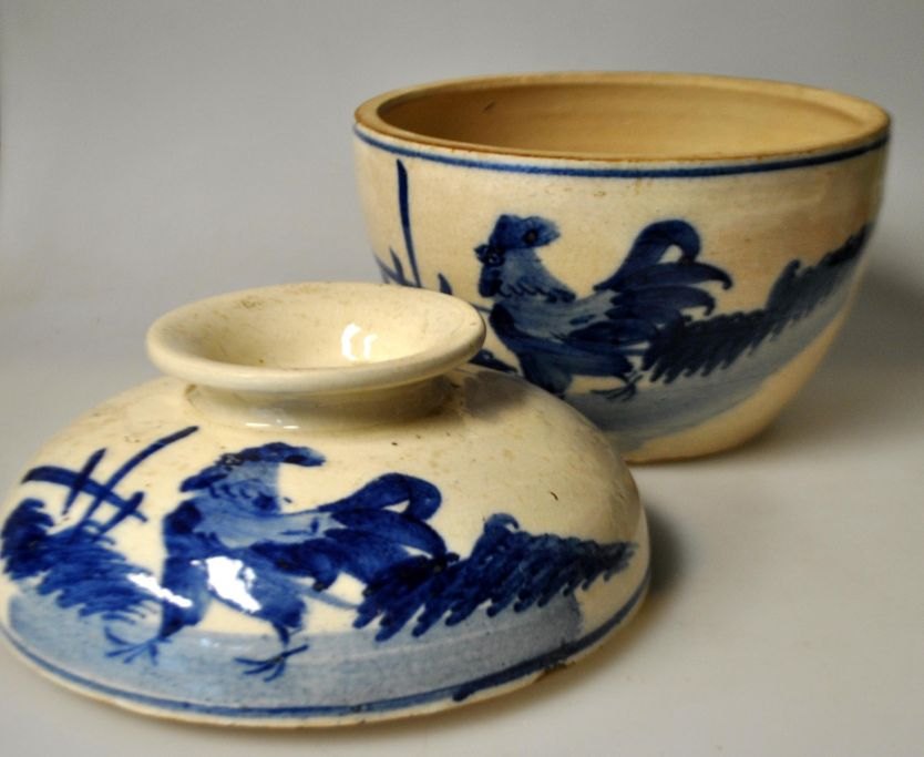Kinesisk madterrin med låg, fajance, 19. årh. Blådekoreret med hane og tegn. H.: 19 cm. Dia.: 17 cm.Emne nummer: 28438