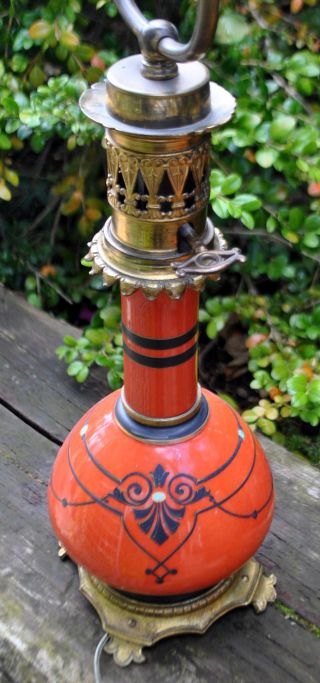 Fransk bordlampe, 19. årh. Tidligere petroleumslampe, omgjort til el. Bronze og korpus i rødt porcelæn med dekorationer. H.: 59 cm.Emne nummer: 28446