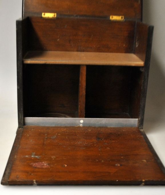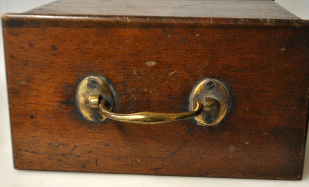 Engelsk æske i mahogni med håndtag. 19. årh. Med opklappelig låge. Indvendig med tre rum. Håndtag i messing. B.: 16 cm. L.: 28 cm. H.: 25 cm.Flot stand! Med hul i siden.