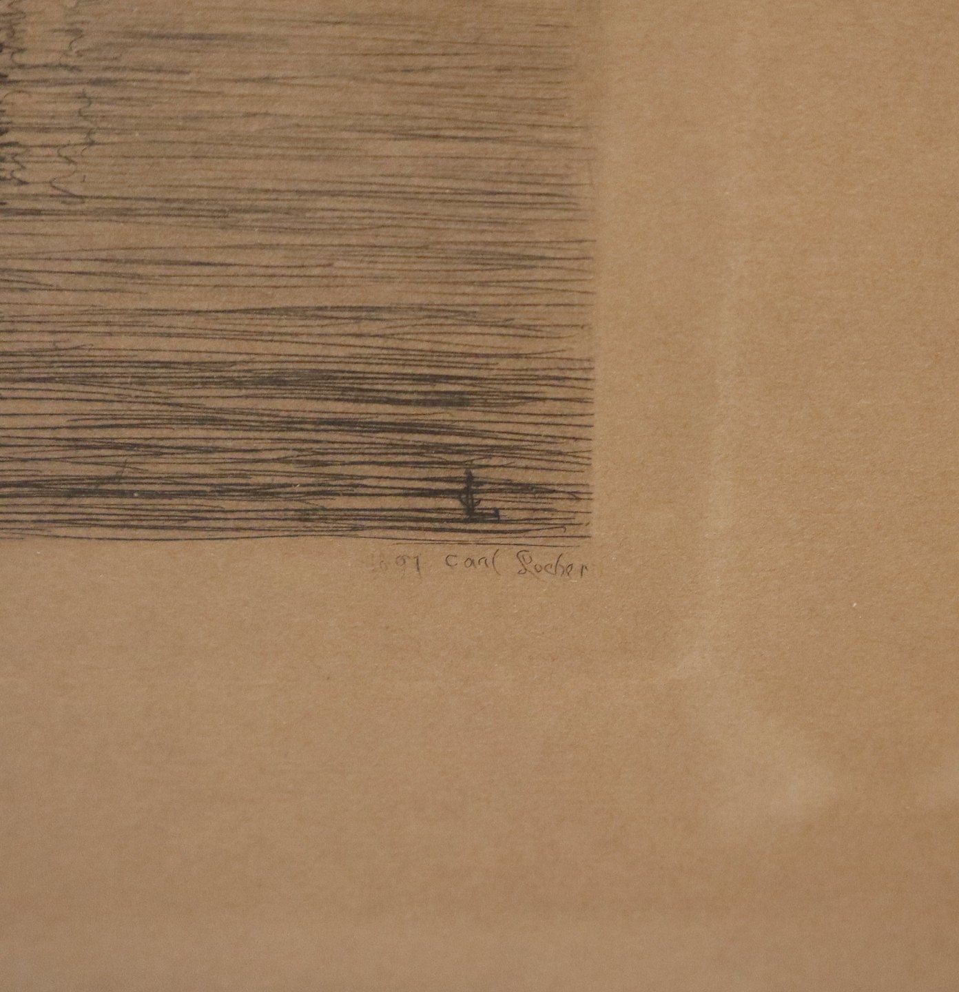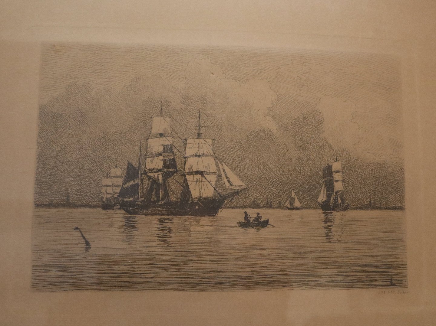 Radering: Carl Locher 1907 Marine motiv med sejlskibe 45 x 41 cm inklusiv originalt glas og guldramme1851-1915 Carl Locher tilhørte gruppen af Skagensmalere