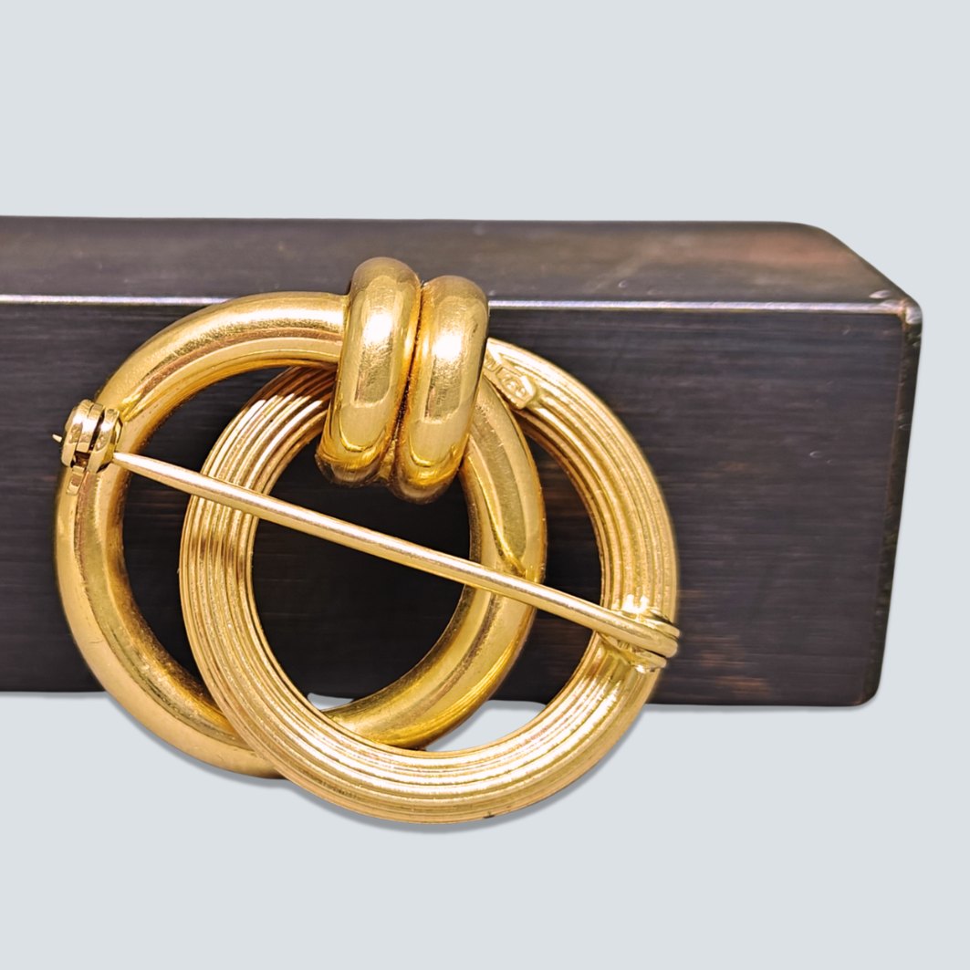 Broche af 18 kt. guld. En cirkel med glat overflade, den anden med riller.L. 3,4 cm. H. 2,9 cm.