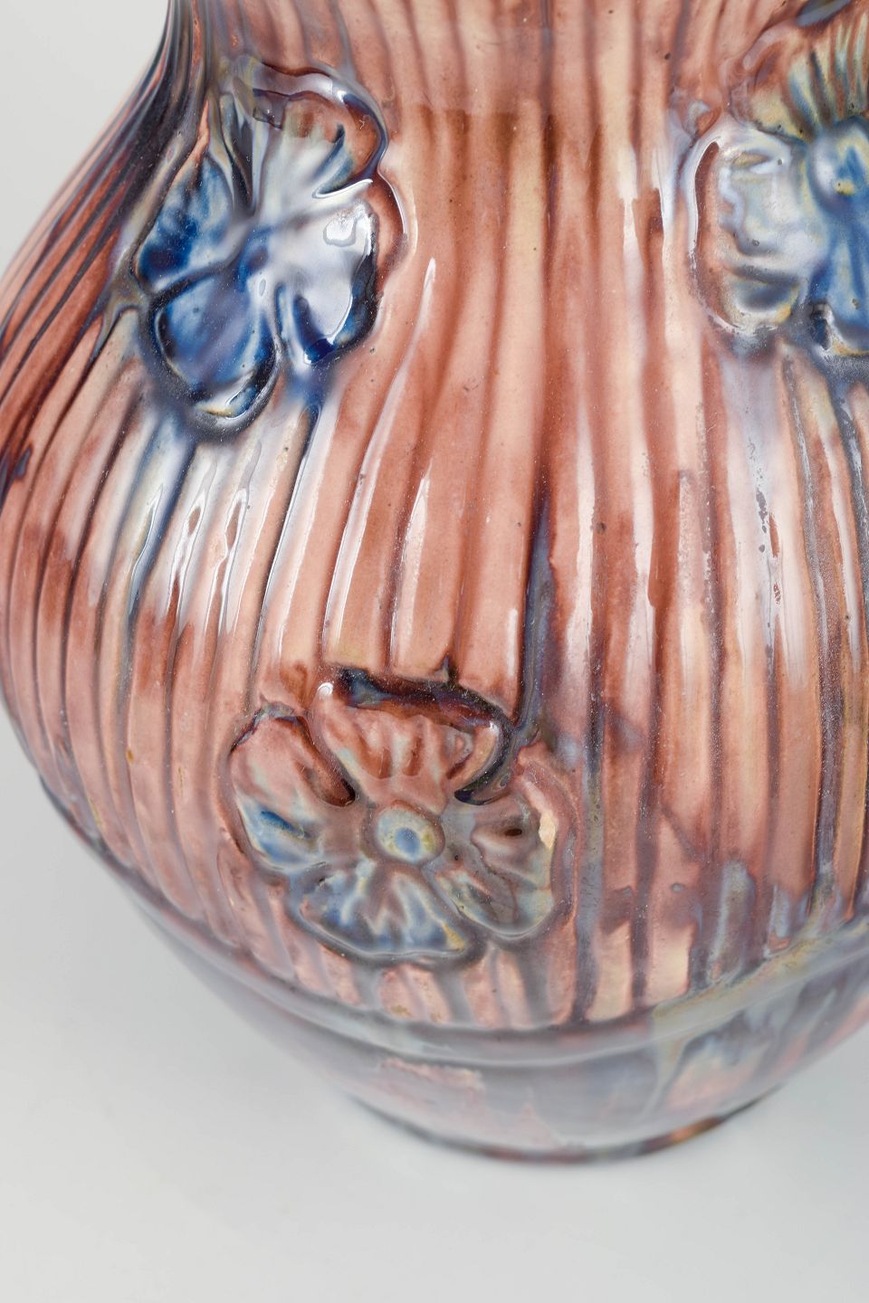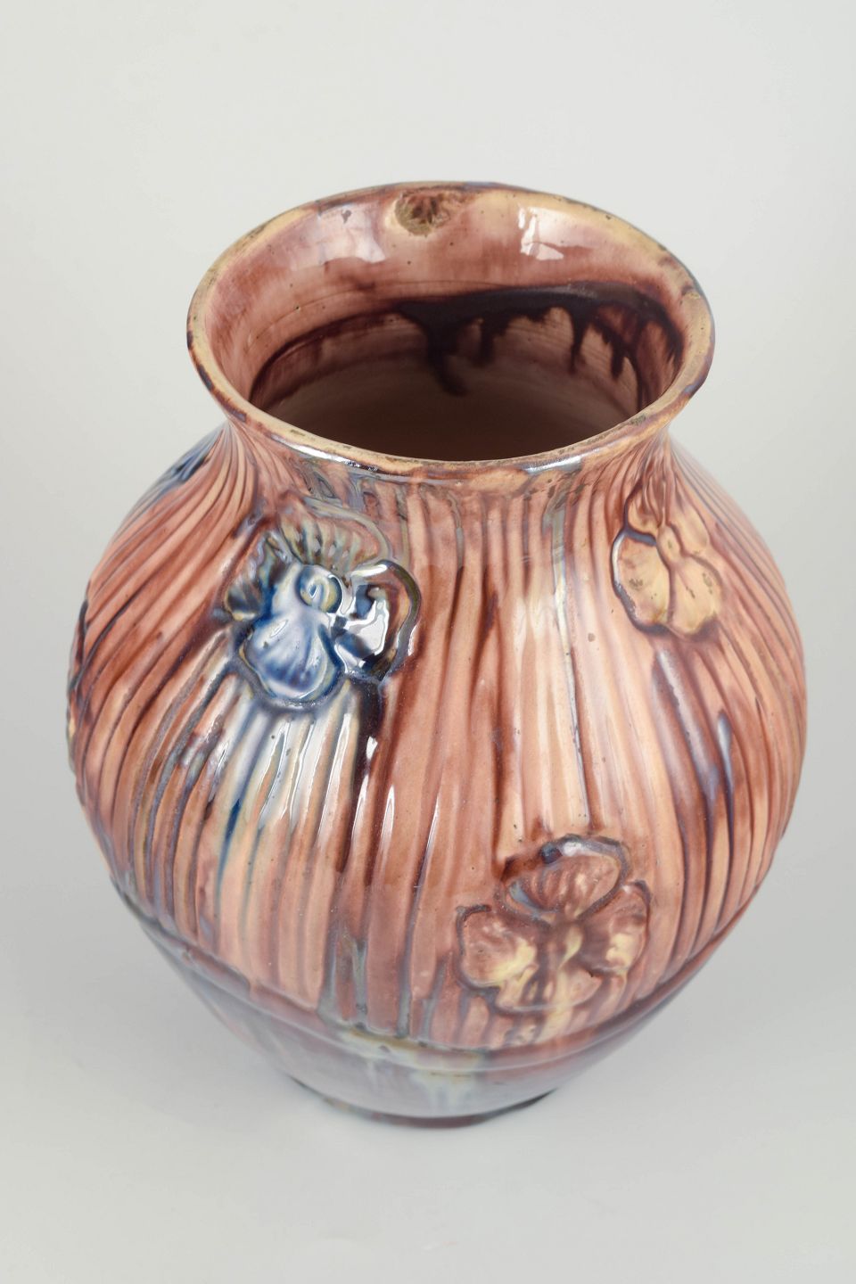 Hånddrejet og rigt modelleret stentøjsvase med vertikale riller og håndmodellerede blomster i relief. Flammet glasur i varme brunlige nuancer med levende blå/violette løbende partier — typisk for dansk jugend og tidligt mellemkrigs-håndværk.