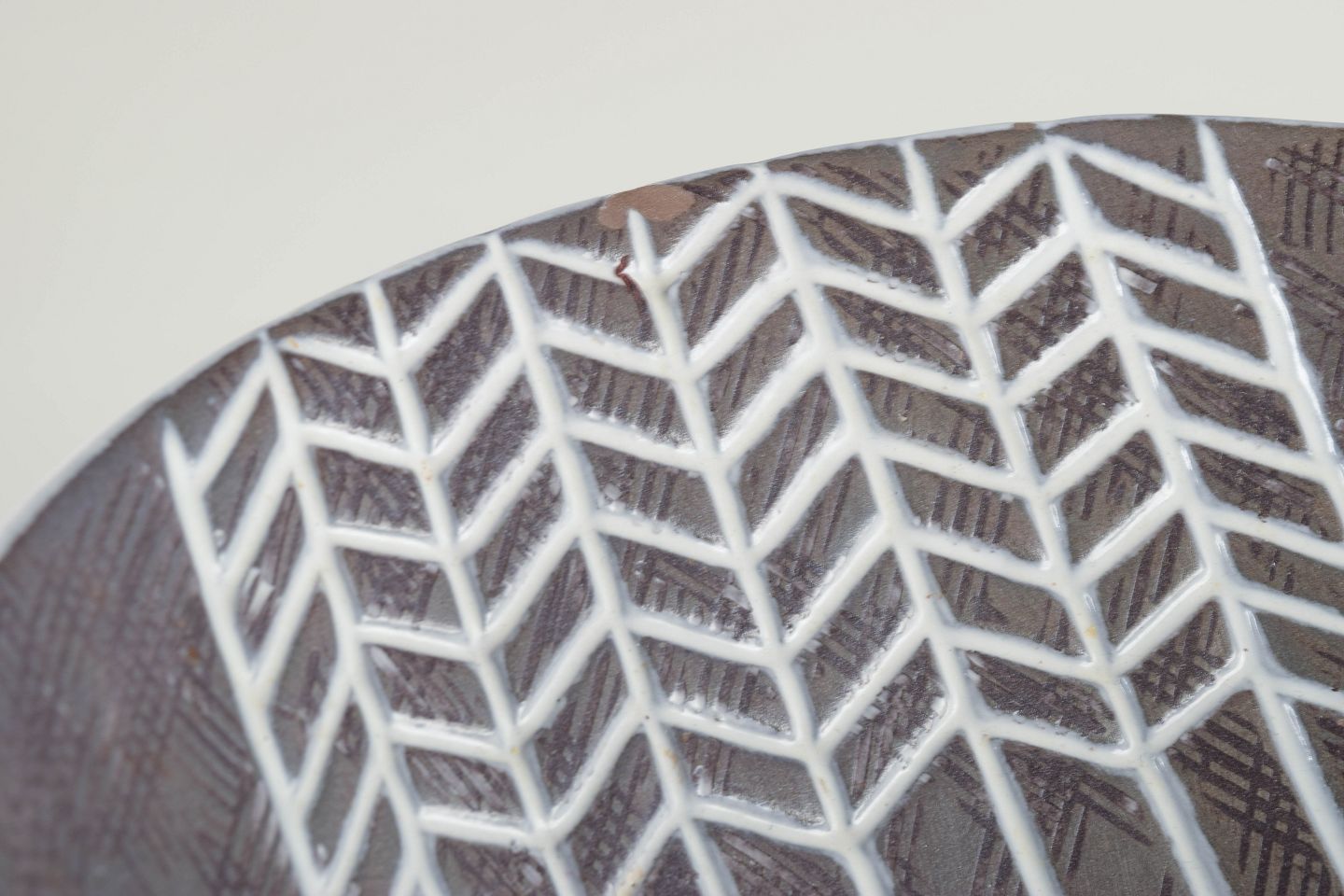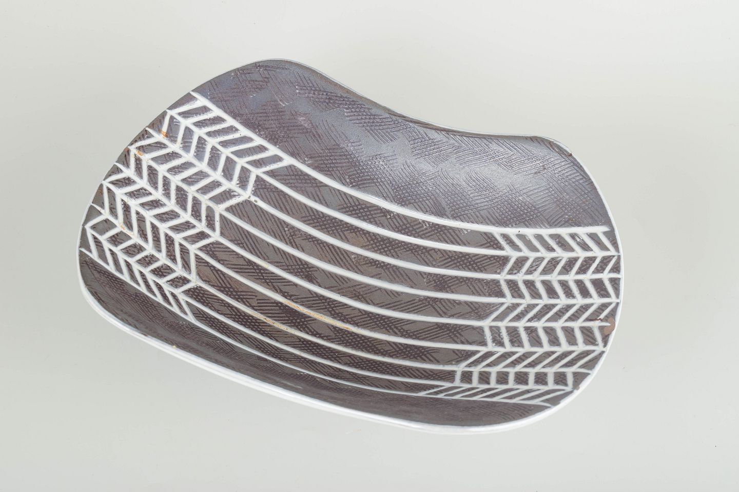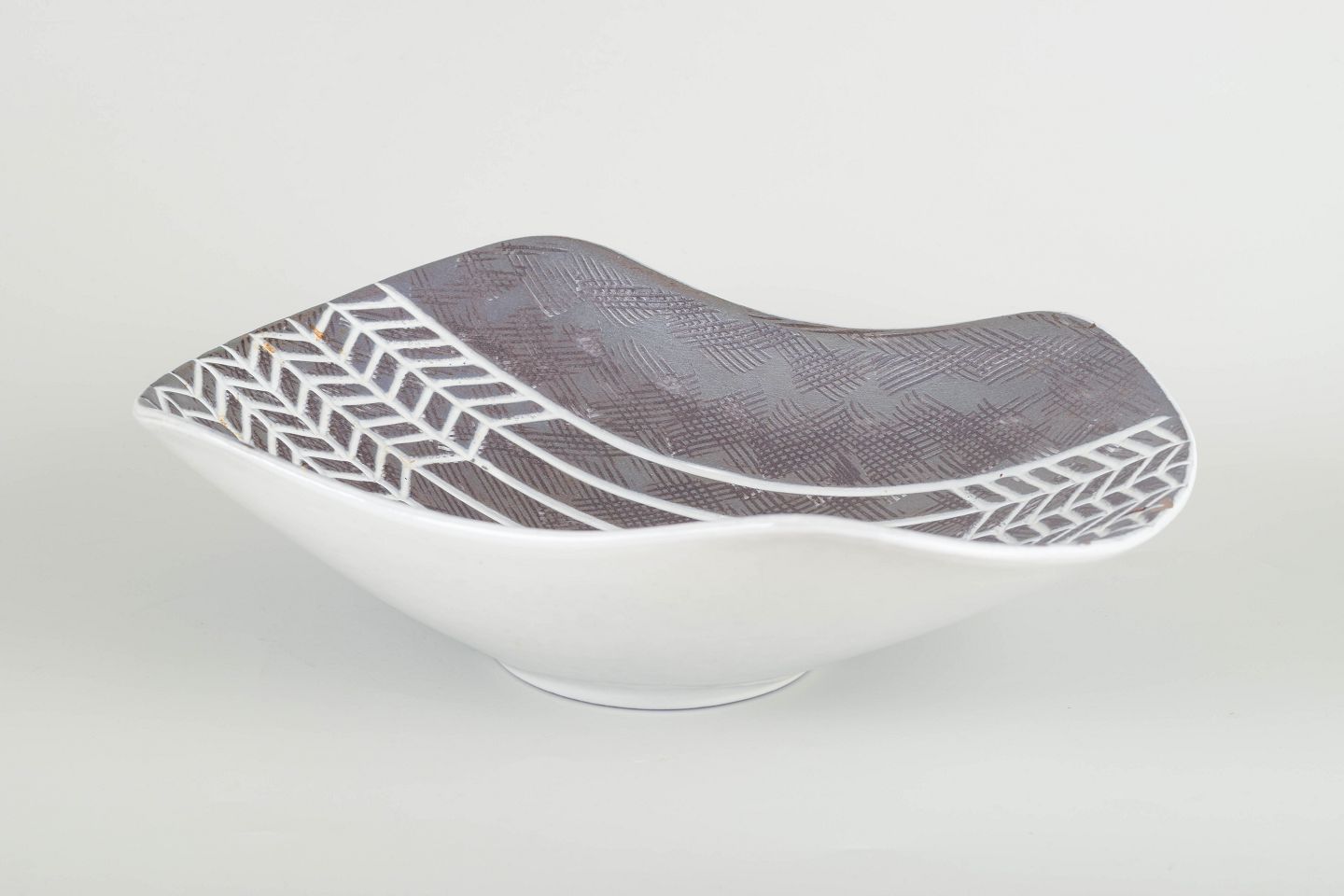 Organisk form med indadbuede sider og gråblå indgraveret dekoration med geometrisk bort.