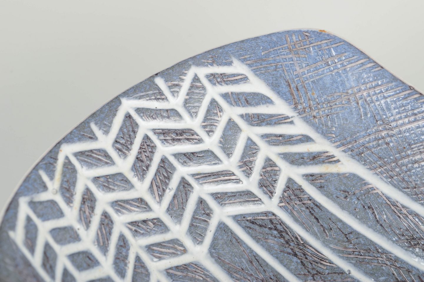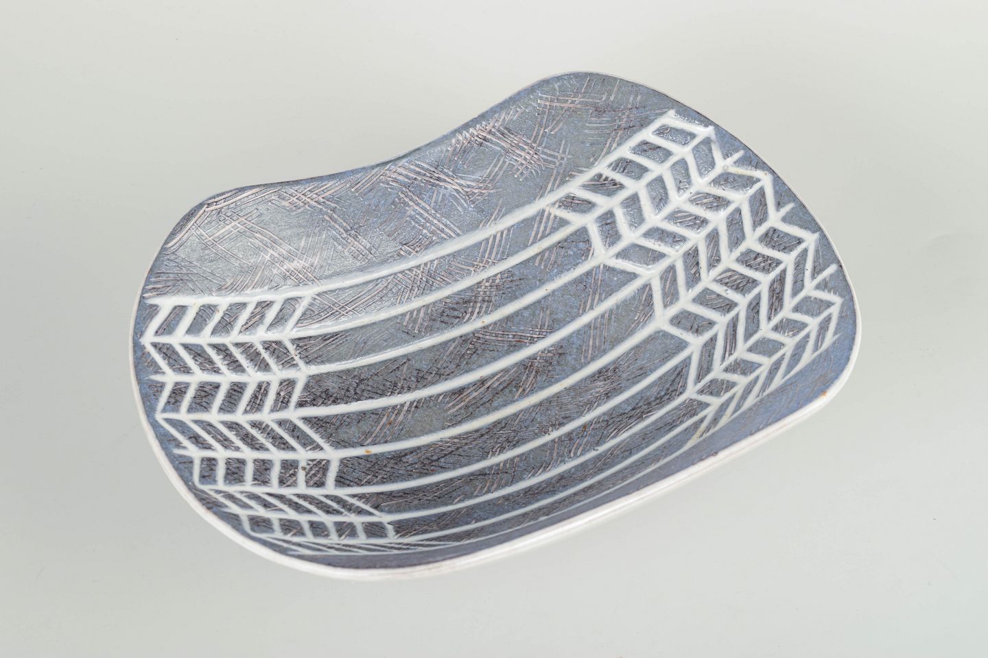 Organisk form med indadbuede sider og gråblå indgraveret dekoration med geometrisk bort.