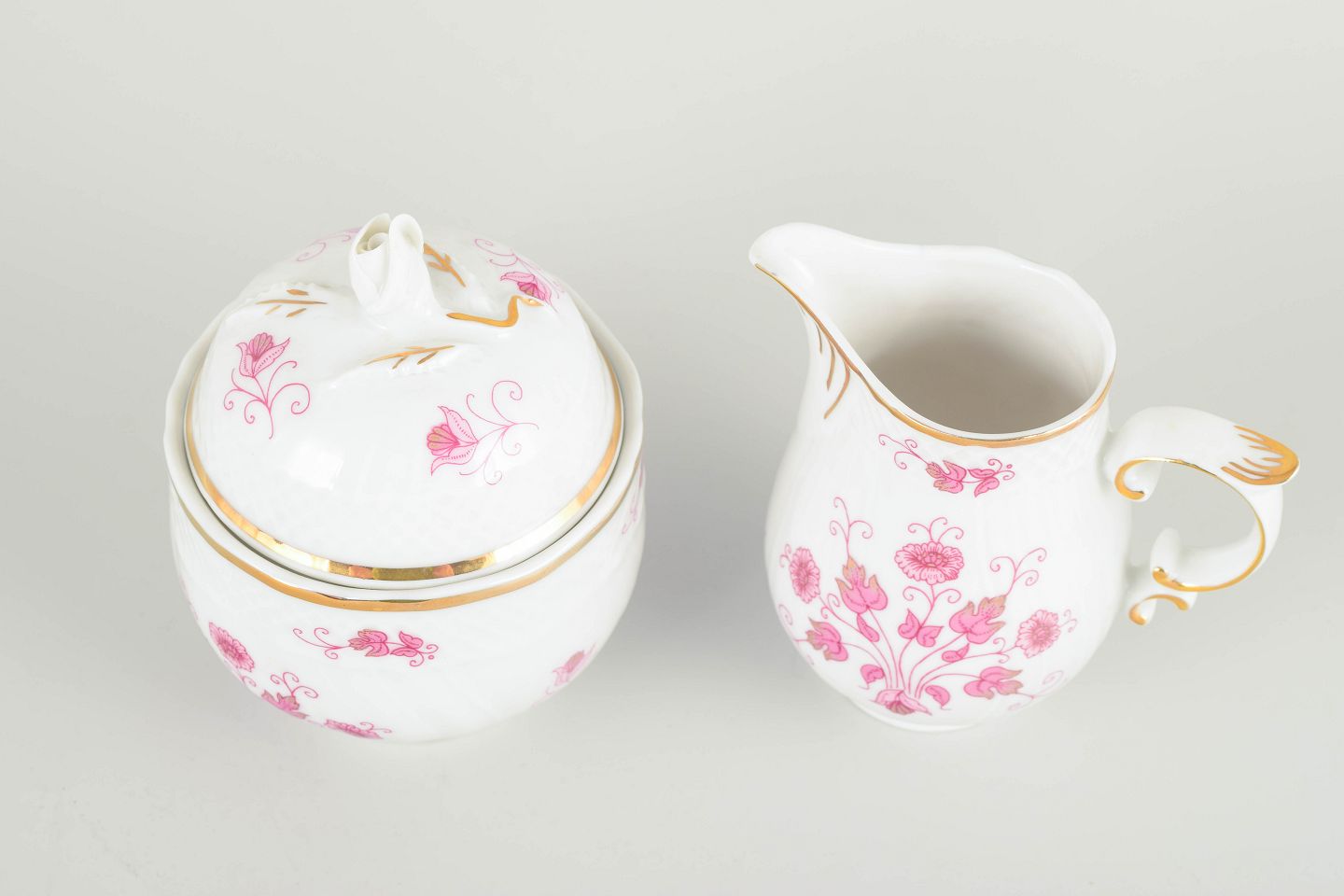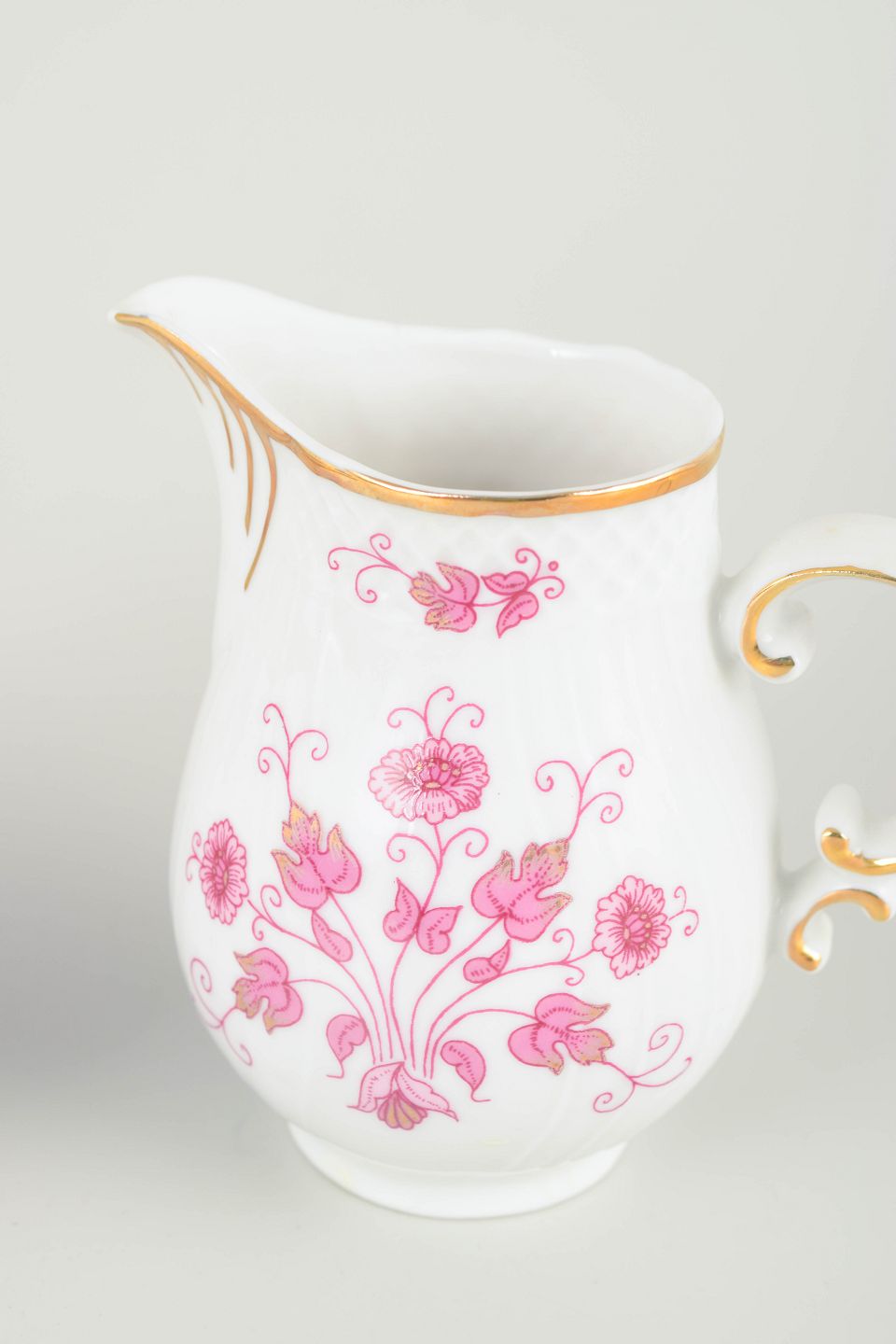 Hånddekoreret porcelæn med lyserøde blomsterdekorationer og forgyldte stafferinger langs kanter og hanke. Klassisk svungen form med delikat elegant udtryk.