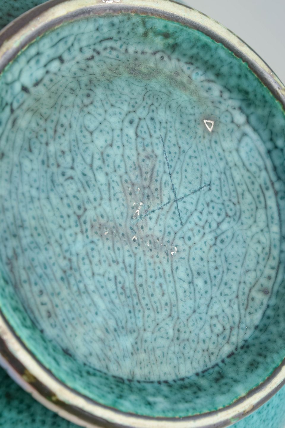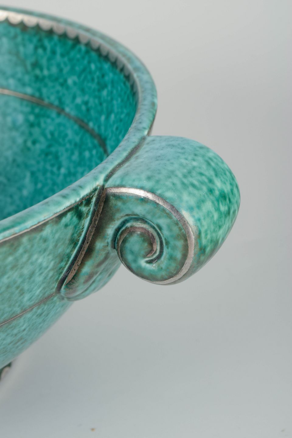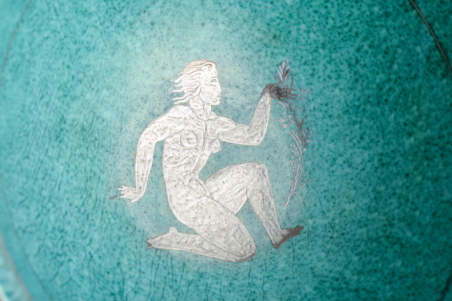 Stentøj med turkis glasur og indlagte sølvdekorationer, udvendigt dekoreret med håndindridset kvindefigur og stiliseret grenmotiv. Svungne dobbelthanke i klassisk art deco-stil.