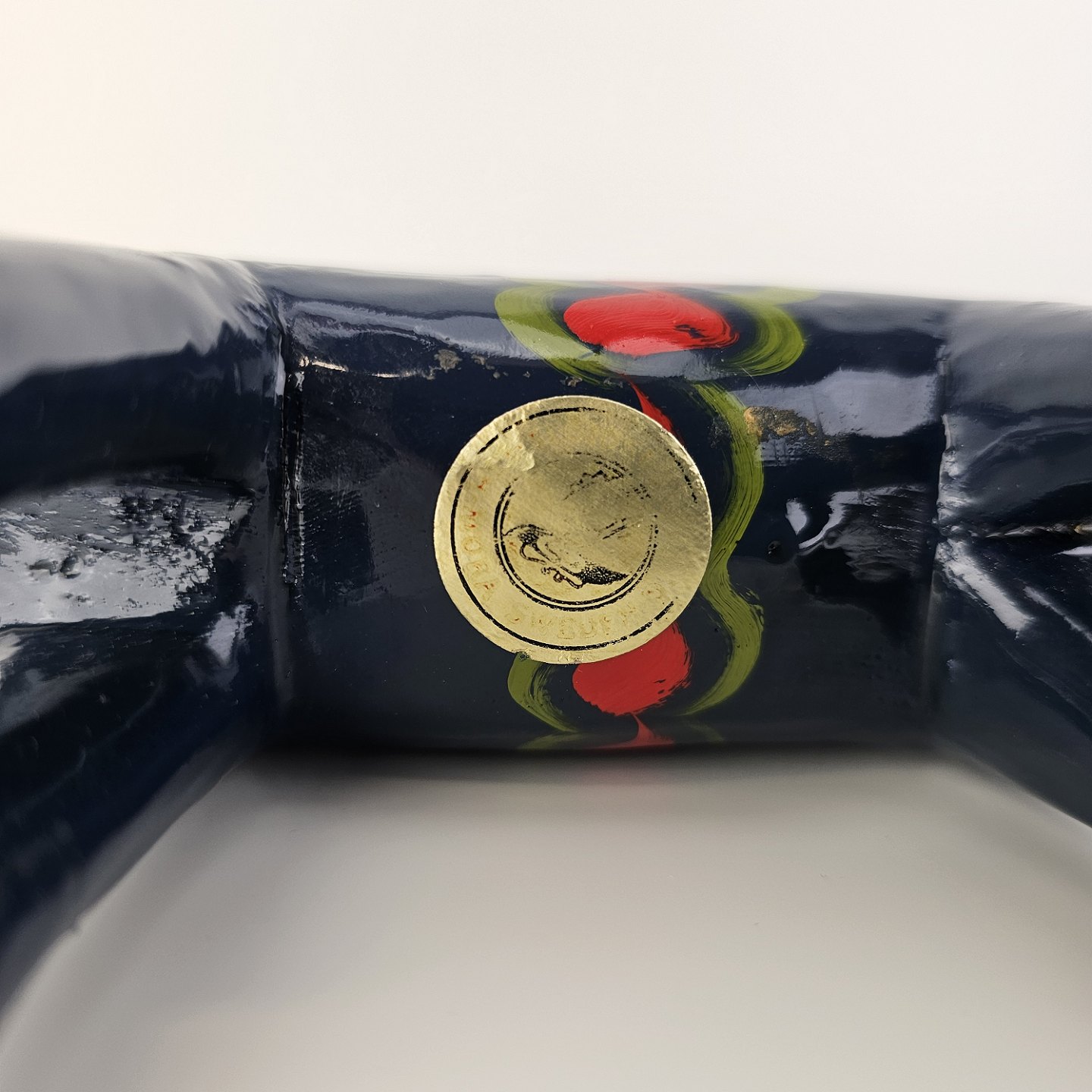 Har et mærkat under bunden som er delvist skrabet af