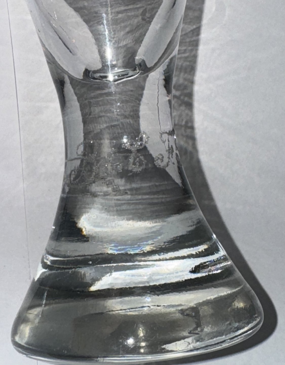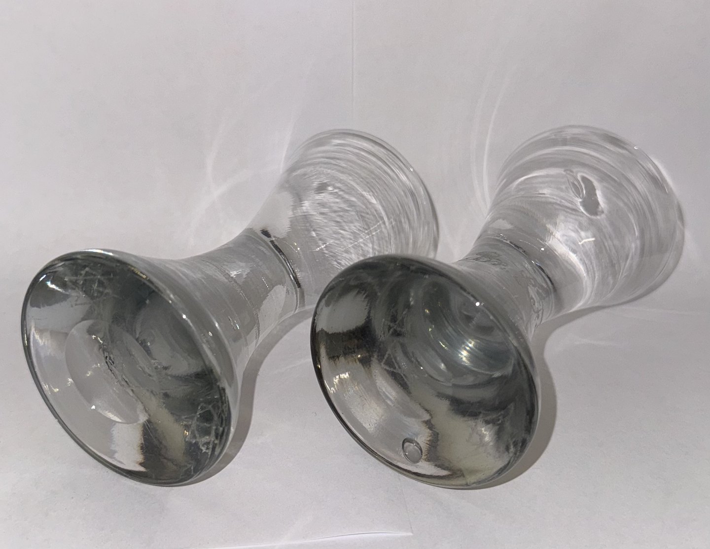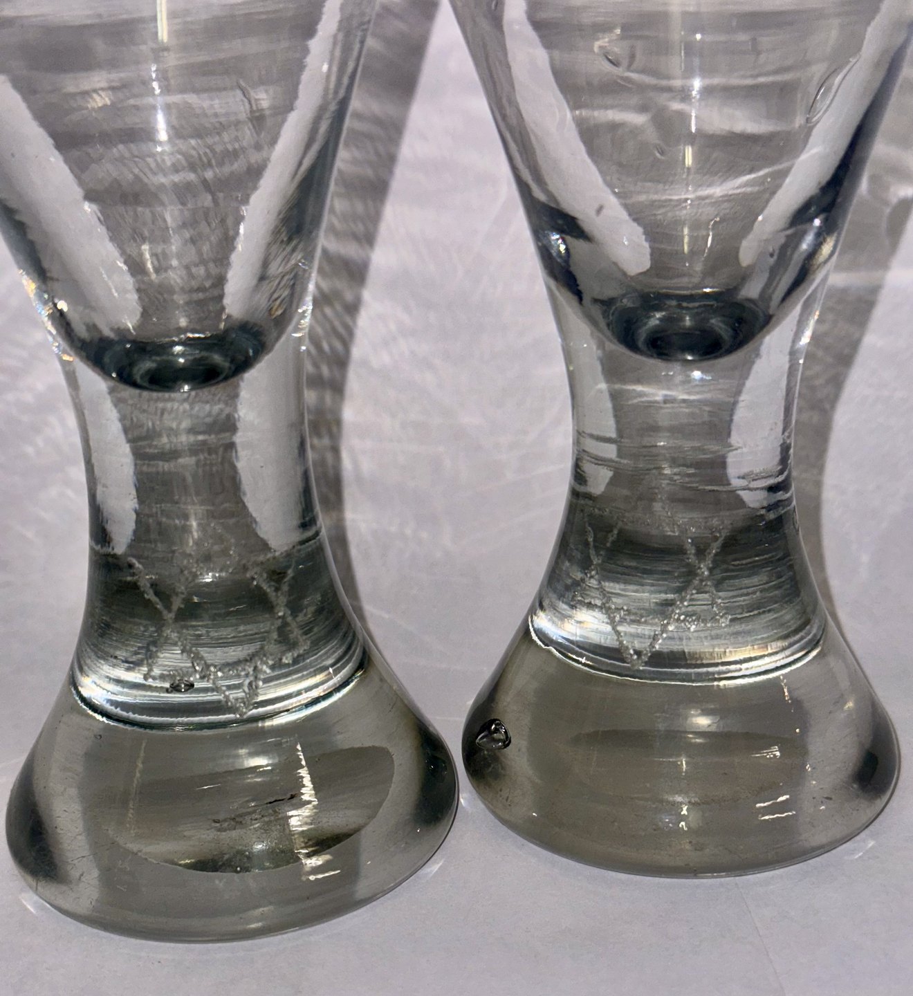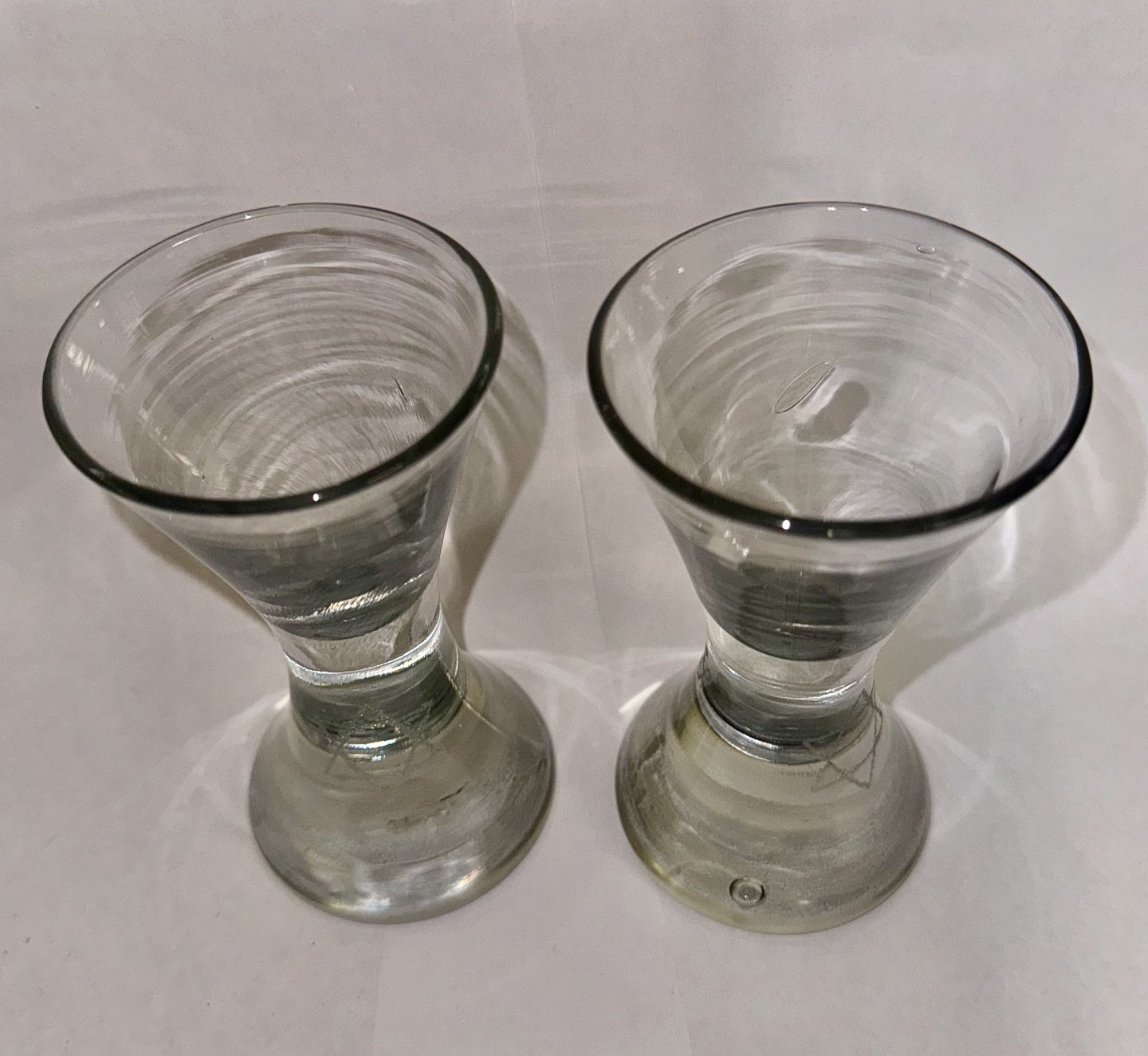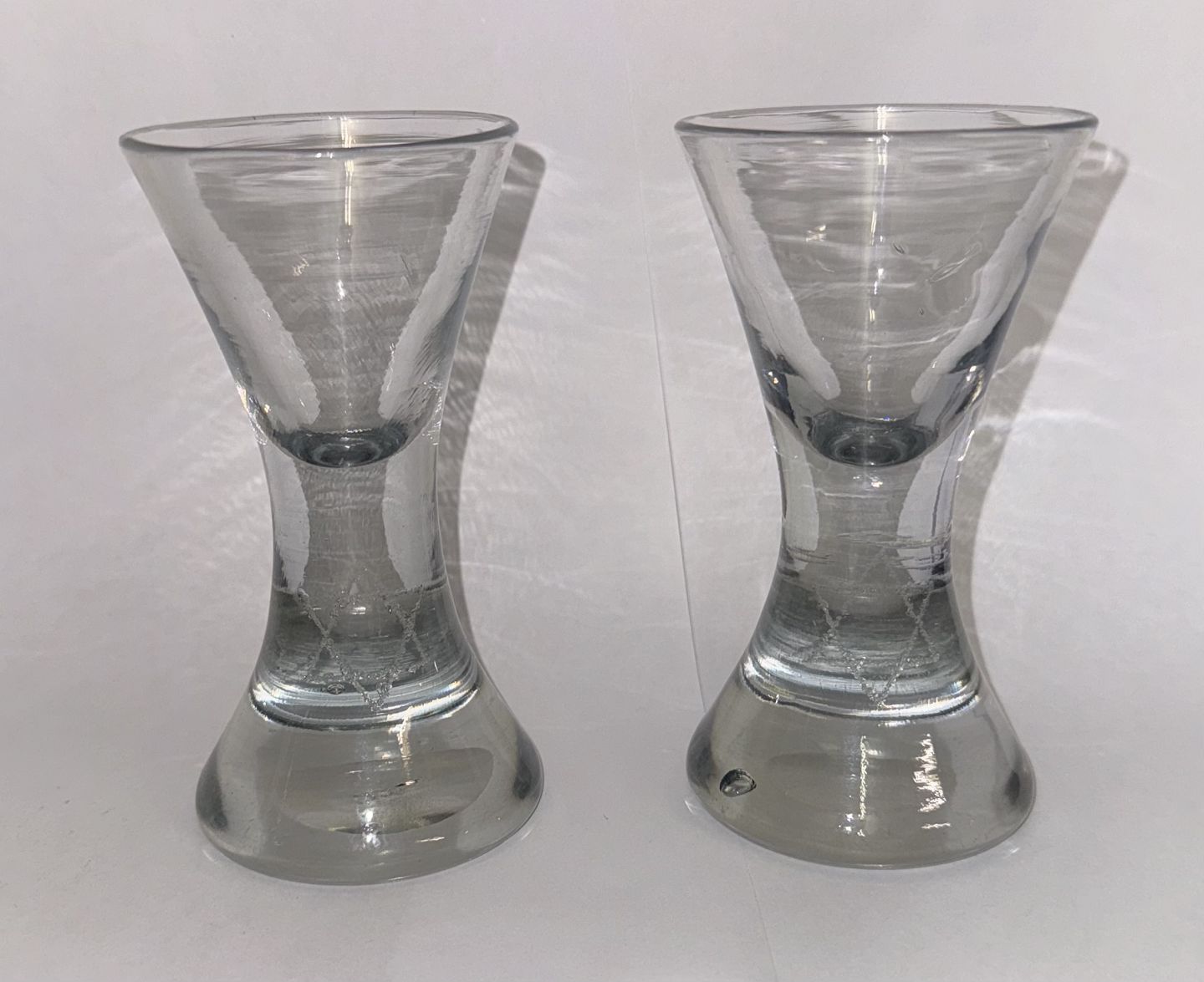 Par timeglasformede frimurer glas. Begge graveret med Davidsstjernen. Ét glas med indgraverer initialer. Begge glas tydeligvis gamle idet der ses flere indikatorer herpå, bl.a. små “lus” i glasmassen, kugleslibning på bunden samt brugsspor. Ingen skader eller reparationer. H. 13 cmv/ Jesper Reutemann