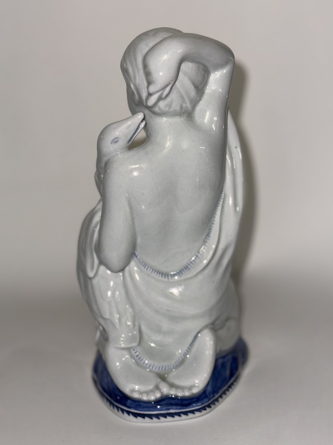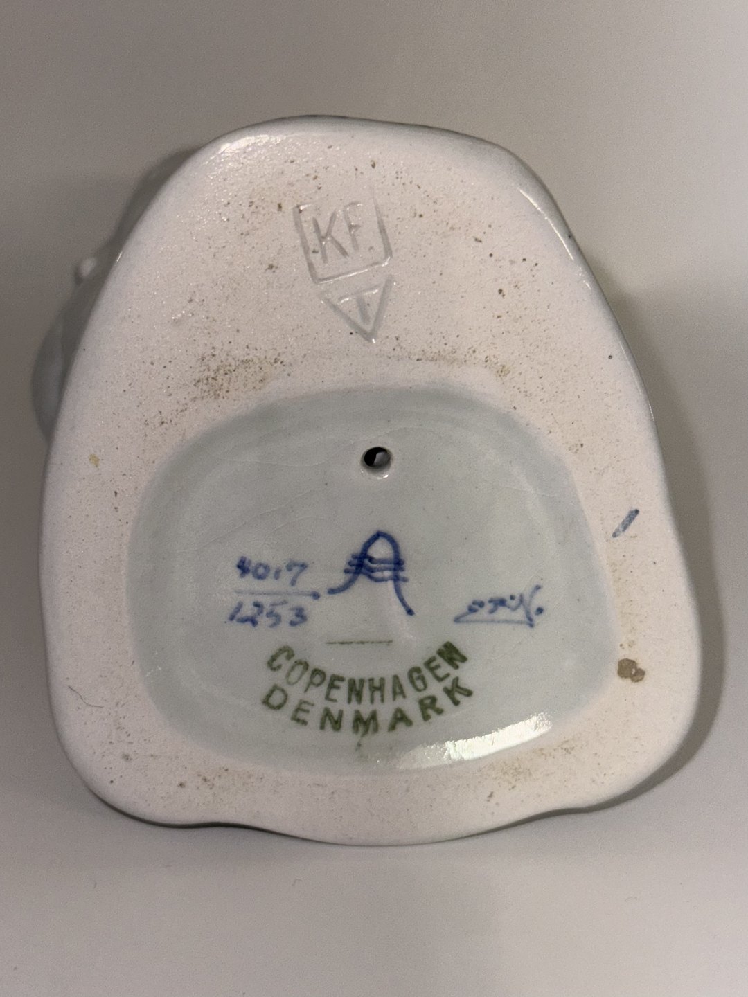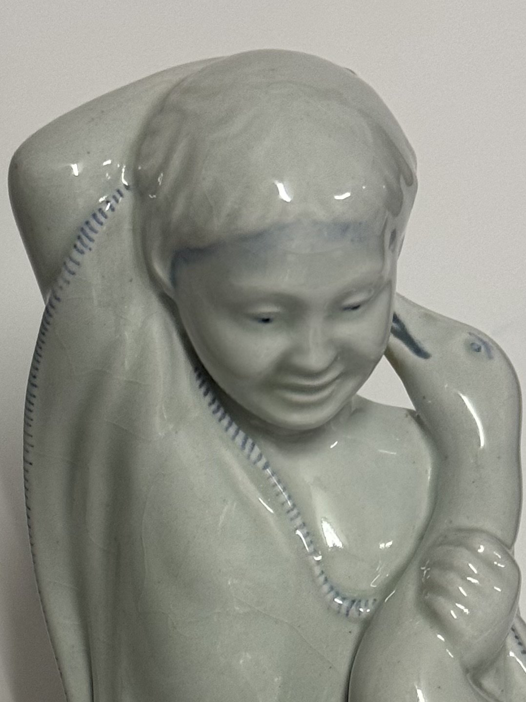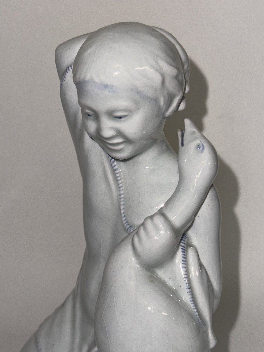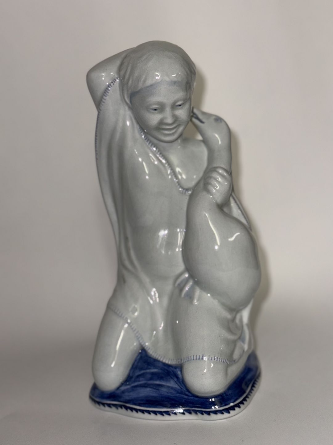 Figur i fajance forestillende ung pige på knæ med med gås i favnen. Fremstillet for Aluminia af den danske billedhugger Michael Pedersen (1882-1918). Lettere krakkeleret. Fabriksmærket på bunden med logo Samt modelnummer 4017/1253. I god stand uden skader. 1. Sortering. H. 16 cm.v/ Jesper Reutemann