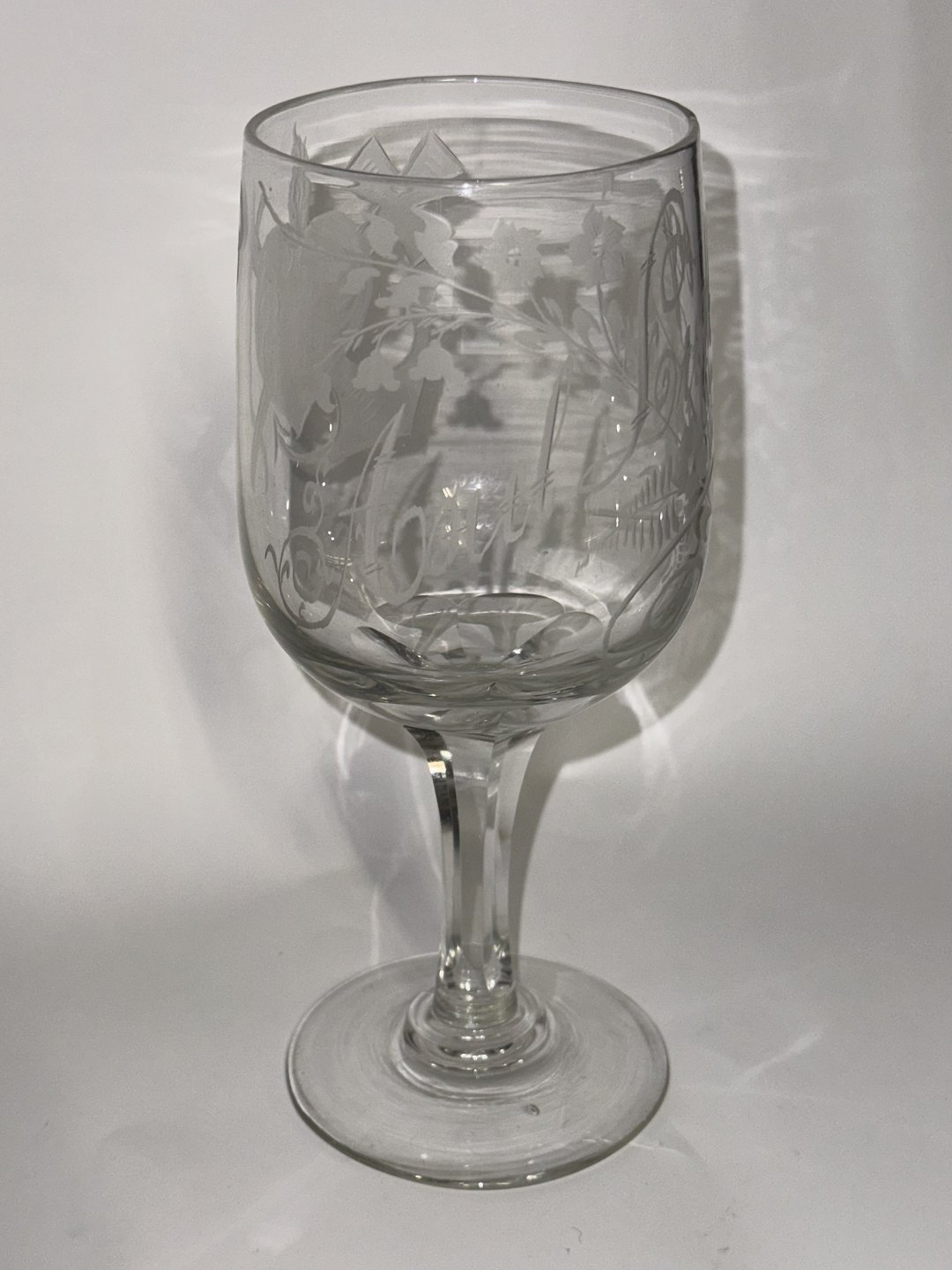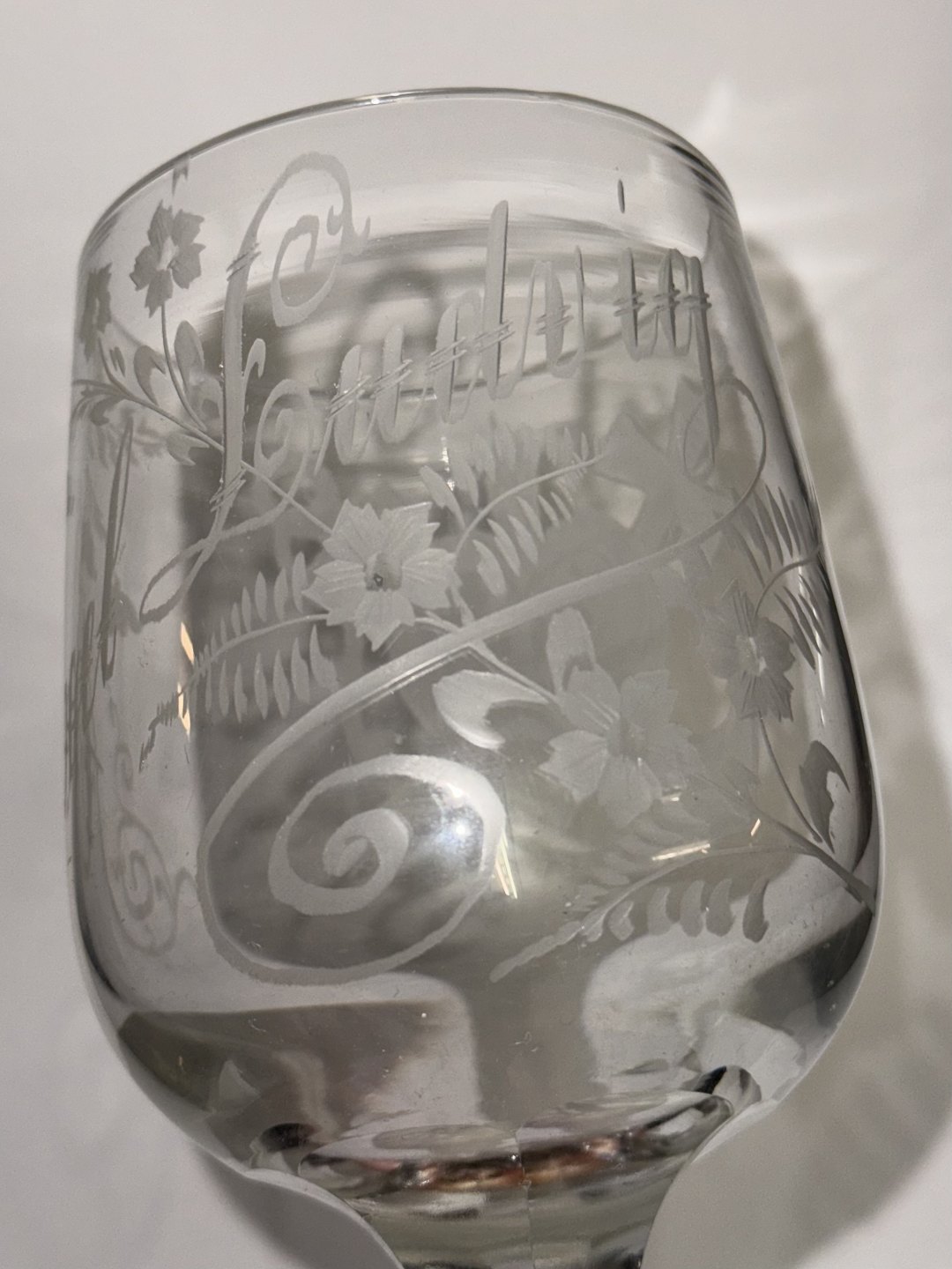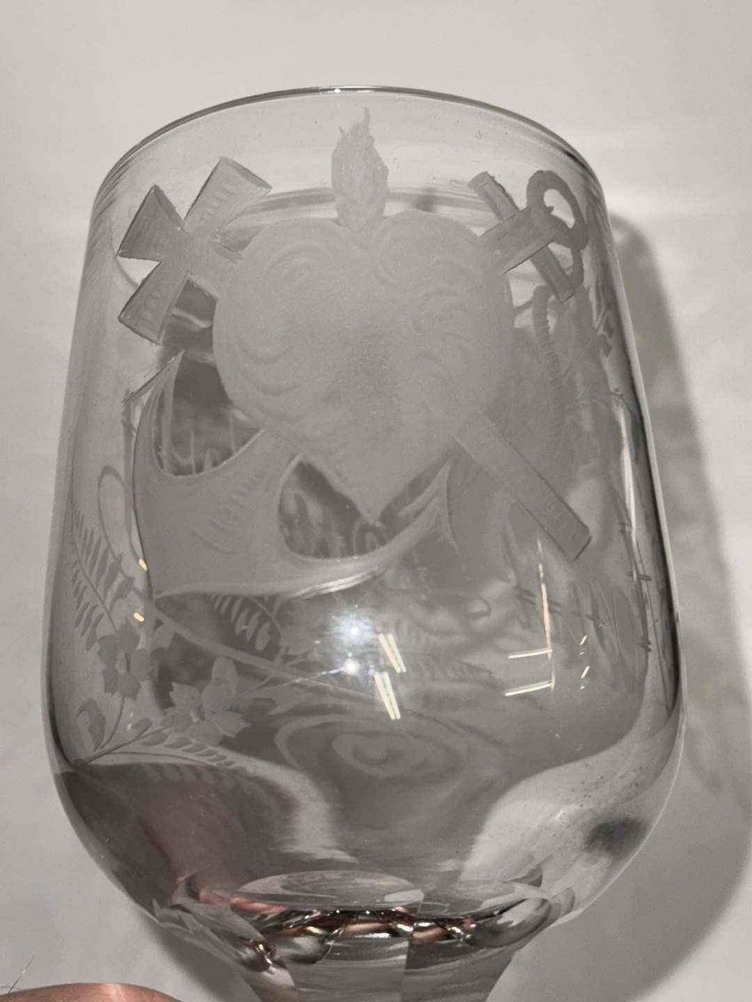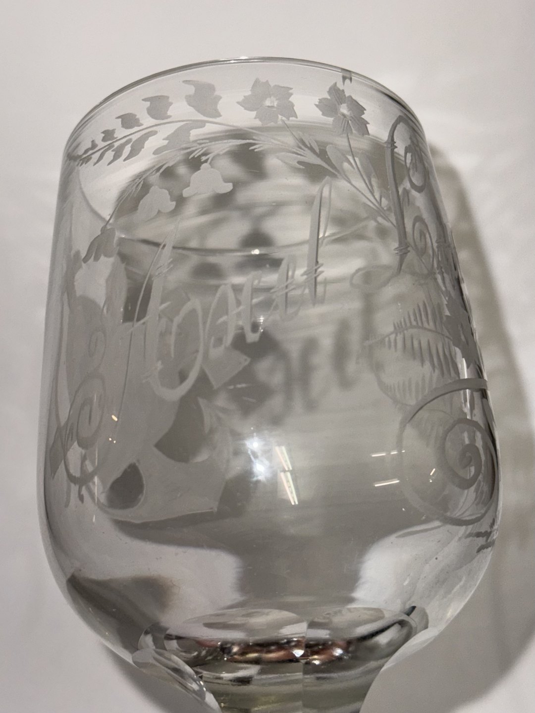 Gammelt vinglas fra Aalborg Glasværk fra omkring 1900. Dekoreret med navnet “Axel Ludvig”. Facetteret stilk.På bagsiden motiv med kors, anker of hjerte (symbol for Troo, Håb og Kærlighed). Fremstår i god stand uden skader eller reparationer. H. 18,8 cm