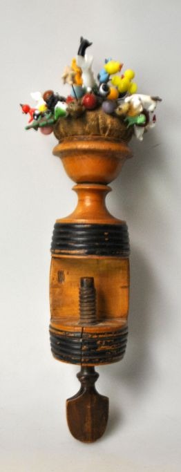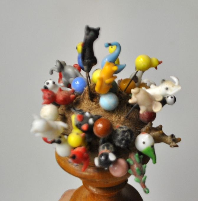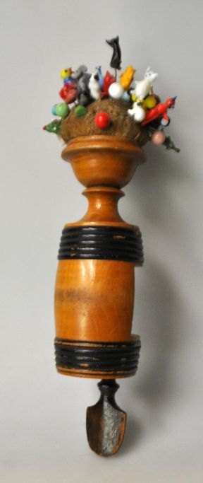 Antik dansk syskrue med nålepude, 19. årh. Danmark. Udformet som en tønde i birketræ med sorte bånd. I nålepude mere end 40 forskellige nåle med glasfigurer, bl.a. elefanter, hunde, katte, høns, ænder m.v. Højde med nåle: 30 cm.Perfekt stand!