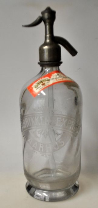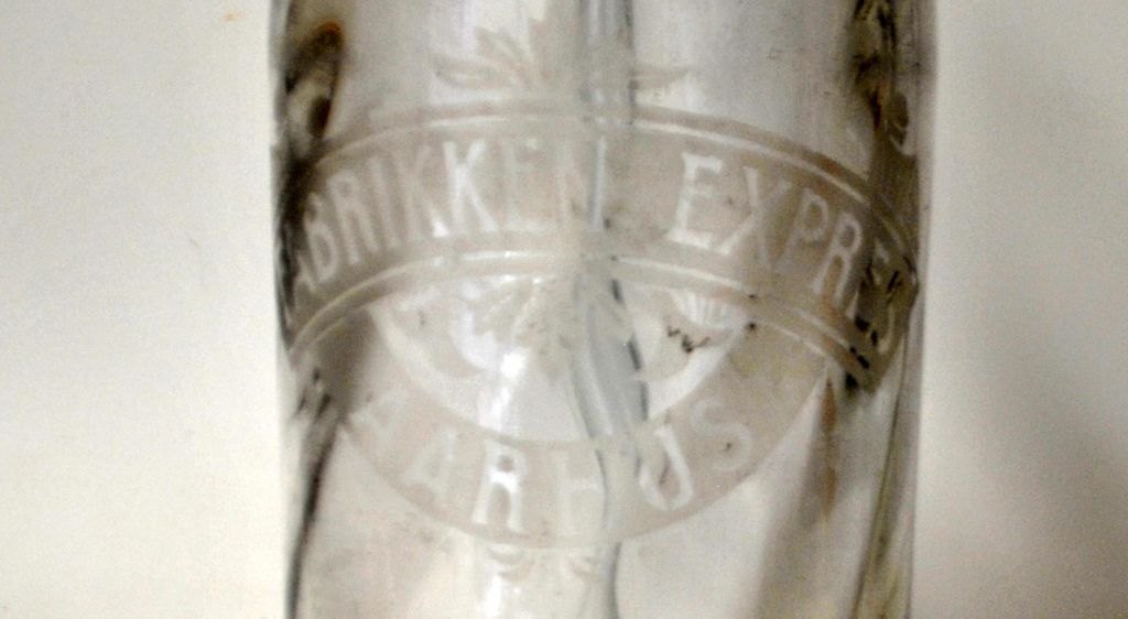 Chiffon flaske, Aarhus, Fabrikken Expres, 19. årh. Danmark. Klart glas med ætsninger. H.: 30 cm. Med påklæbet bånd fra Sct. Nicolauskilde.Perfekt stand!