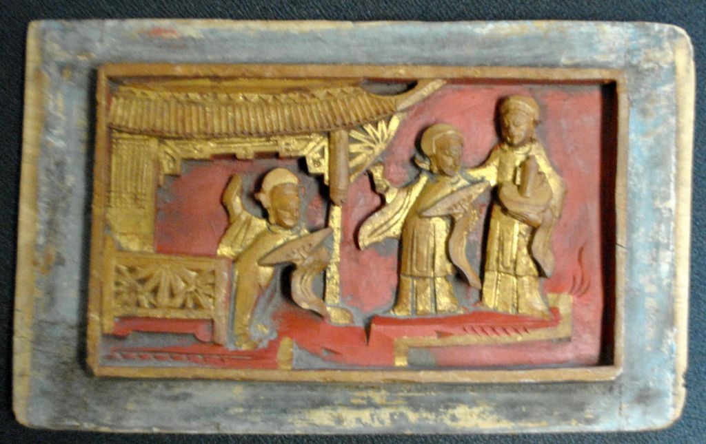 Antik kinesisk bemalet træskæring, 19. årh. Med sceneri med kvinder i en bygning. 15 x 24 cm.Emne nummer: 28465