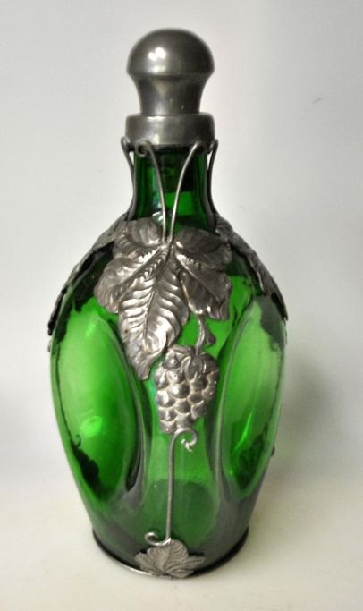 Art deco trekantet grøn flaske med tin montering, 1930'erne, Danmark. H: 25 cm.Emne nummer: 28311