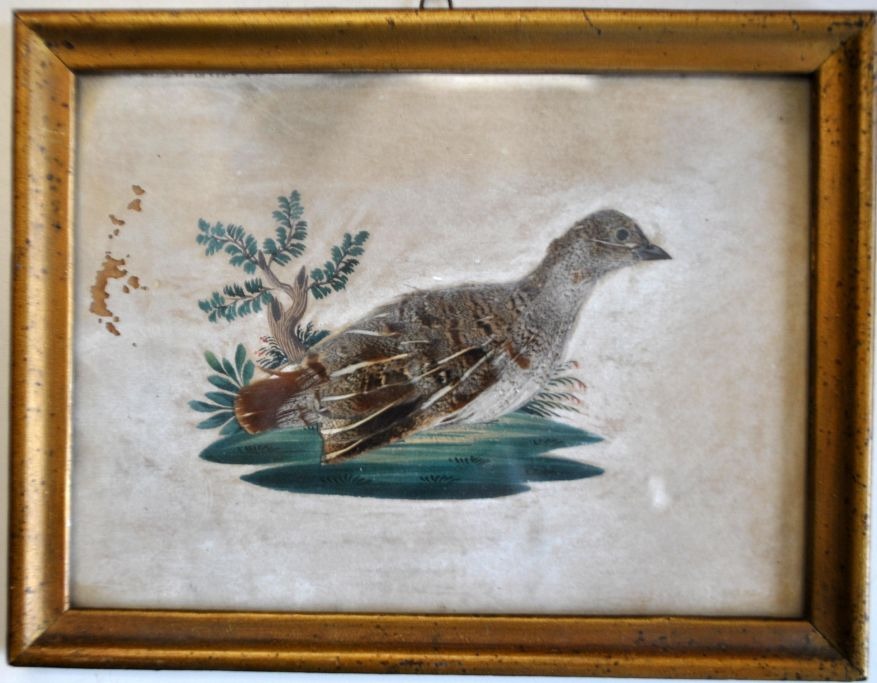 Kiebitz, Wilhelm (1847 - 1869) Danmark: En agerhøne. Fjerbillede på papir. Med akvarel. 13,5 x 18,5 cm.Indrammet: 17 x 21,5 cm.
