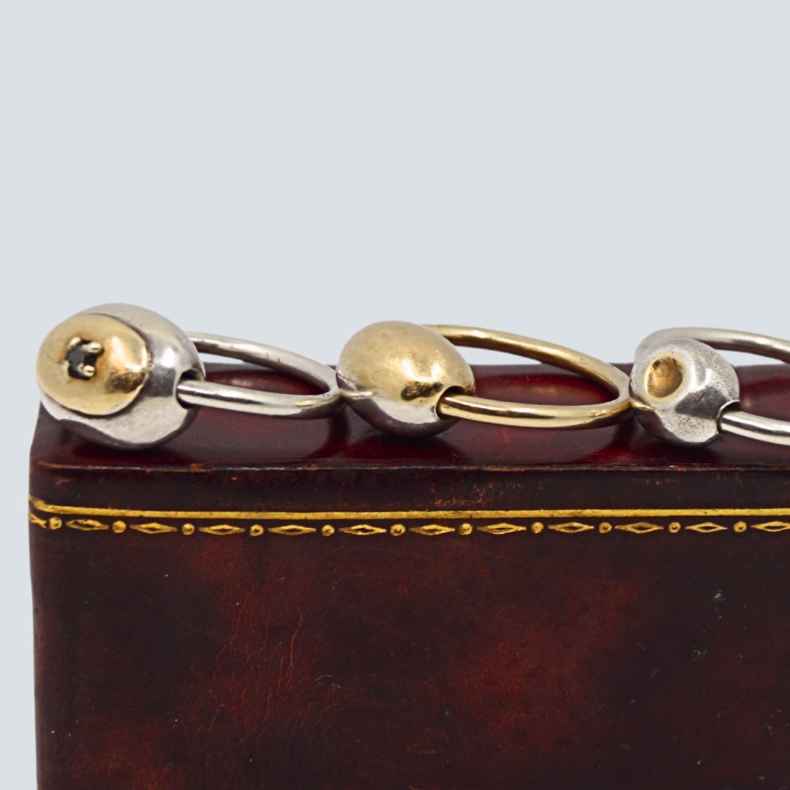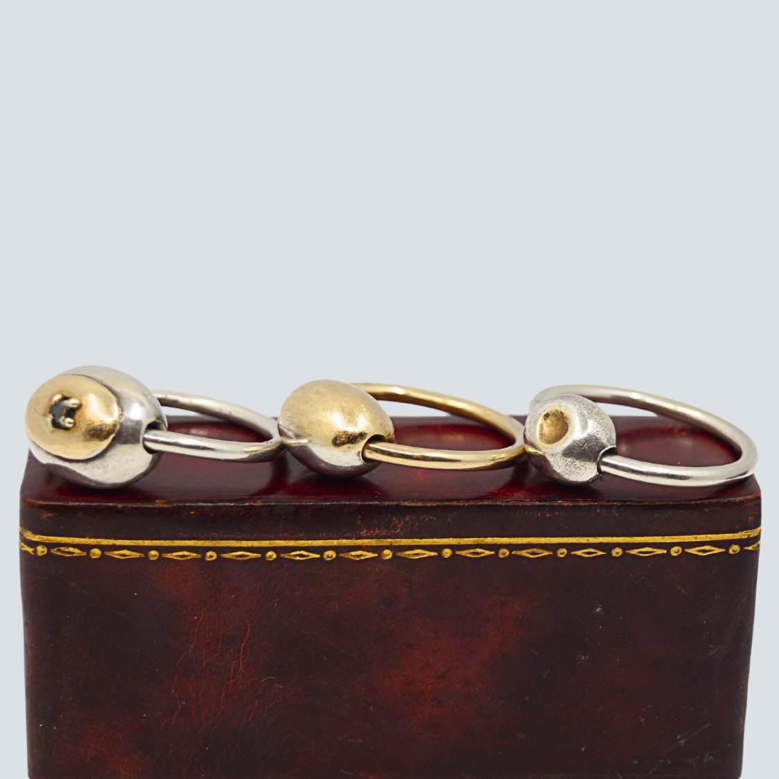 Anette Kræn; Sæt af tre fingerring af sølv prydet med guld. En prydet med guld og safir.Indvendig dia. 2,5 cm.