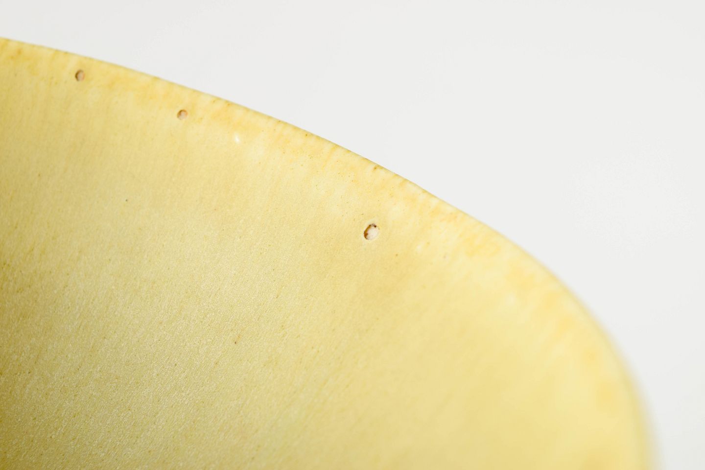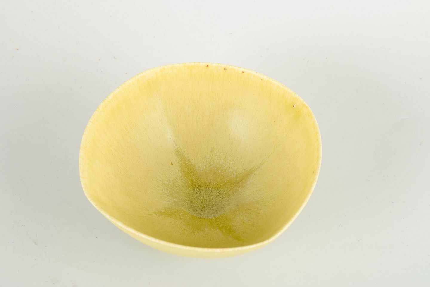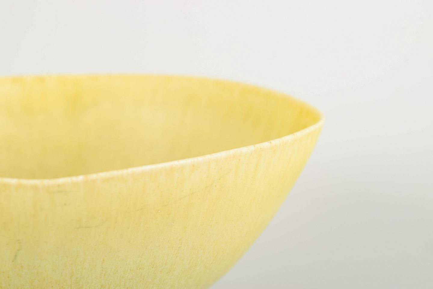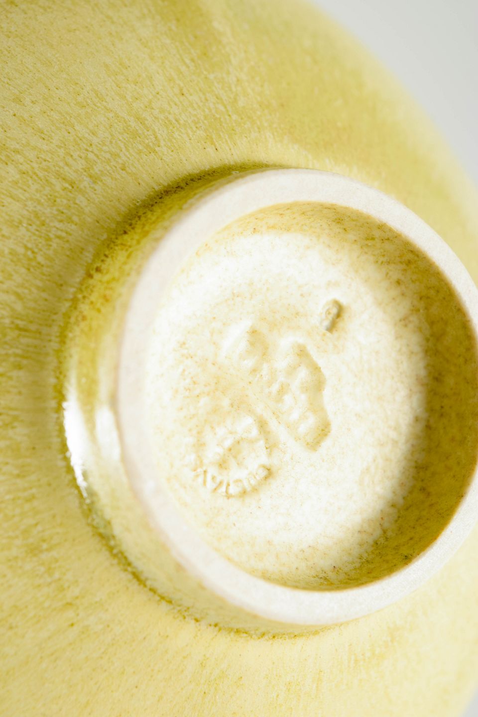 Hånddrejet lille stentøjsskål med elegant, afrundet form og karakteristisk varm gul tennglasur. Fin Friberg-typisk mikro-glasur tekstur med små glasurblærer (se foto).